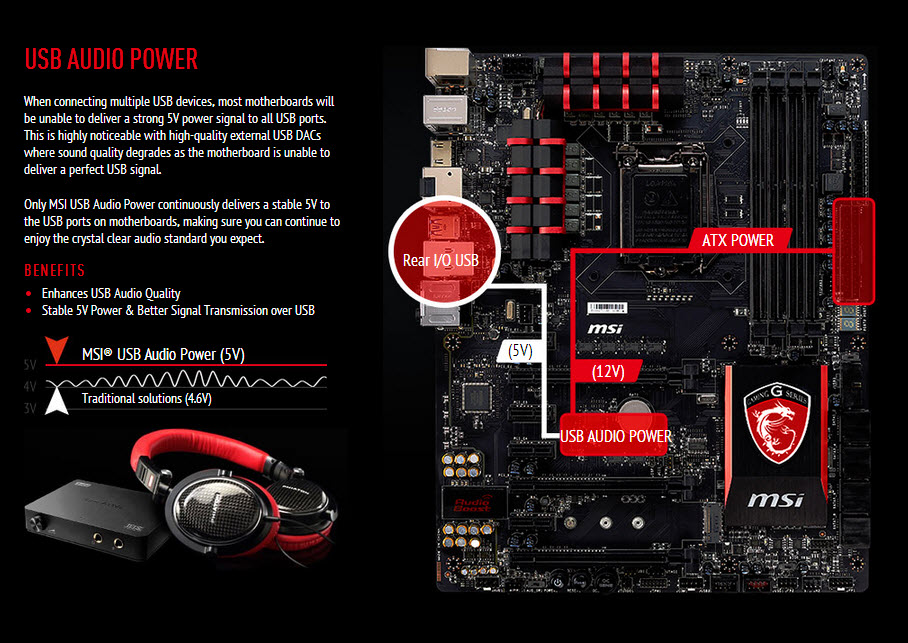 بعيداً عن البطاقة الصوتية المدمجة حتي سماعات الرأس التي تتصل بالUSB لم تتخلي عنها MSI ووفرت لها منافذ USB محدده لتوفر طاقة ثابته مستقره بقدرة 5V.