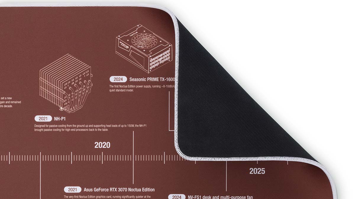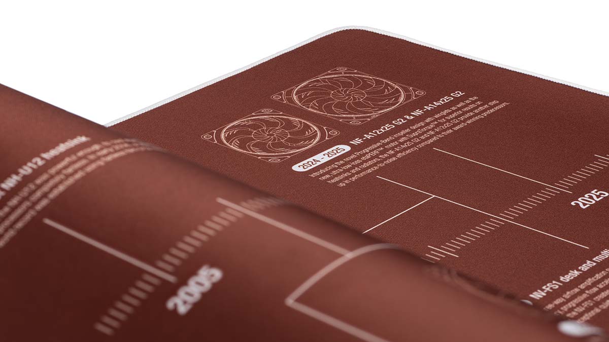 ويأتي منتج NP-DM3 كجزء من احتفالية الشركة، وهو بادة مكتب فاخرة تحمل تصميمًا زمنيًا يبرز مراحل تطور العلامة التجارية. يمتد التصميم من أول مبرد ومروحة إلى أحدث سلسلة G2، ويستعرض نماذج رمزية مثل NF-P12 وNH-D14 التي شكلت علامات فارقة في تاريخ الشركة.