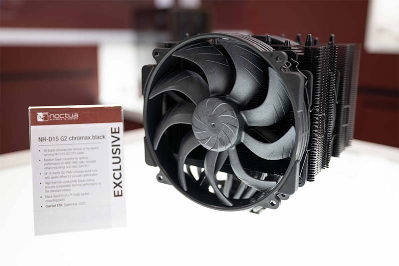 كما تم عرض lمنتجات باللون الأسود بالكامل من مبرد وحدة المعالجة المركزية NH-D15 G2 الحائز على جوائز ومراوح NF-A14x25(r) G2 مقاس 140 مم، مما يشير إلى وصولها في سبتمبر 2025. يضمن الطلاء الأسود عالي التوصيل الحراري على المشتت الحراري أداءً حراريًا يضاهي الإصدار القياسي من المبرد وسيكون متاحًا حصريًا في الإصدار القياسي متوسط القاعدة المحدبة، باستثناء طرازي LBC وHBC.