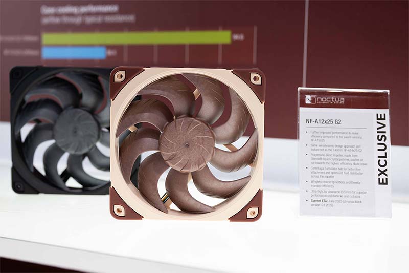 من بين مجموعة واسعة من المنتجات والنماذج الأولية الحصرية، احتلت مروحة الجيل الجديد NF-A12x25 G2، مقاس 120 مم، مركز الصدارة، حيث كانت مكونًا أساسيًا في العديد من المنتجات المعروضة. تتميز هذه المروحة بكفاءة مُحسّنة في نسبة الأداء إلى الضوضاء، وتتضمن تصميمًا جديدًا للمروحة بتقنية الانحناء التدريجي، مصنوعًا من بوليمر Sterrox® البلوري السائل. يدفع هذا التصميم الهواء نحو مناطق الشفرات ذات الكفاءة العالية، بينما يُحسّن محور مُحرك الطرد المركزي تدفق الهواء وتوزيع السوائل عبر المروحة. تجعل هذه الابتكارات المروحة متعددة الاستخدامات للغاية، مُقدمةً أداءً استثنائيًا في كل من التطبيقات ذات الضغط الساكن وتدفق الهواء المكثف. كشفت الاختبارات الداخلية عن تحسينات تصل إلى 3.5 درجة مئوية على مُبرد سائل تبريد مقاس 120 × 49 مم مع حمل حراري بقدرة 200 واط، مقارنةً بالمروحة NF-A12x25 الحائزة على جوائز في ظروف مُعايرة للضوضاء. ومن المقرر إطلاق NF-A12x25 G2 في يونيو 2025، ومن المتوقع إطلاق إصدار chromax.black في الربع الأول من عام 2026.
