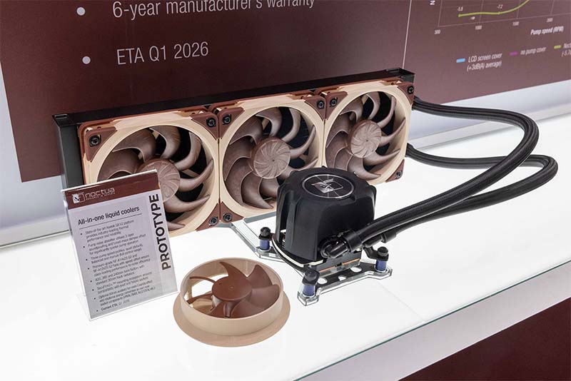 كشفت Noctua أيضًا عن أول نموذج أولي لها لمبرد سائل لوحدة المعالجة المركزية الكل في واحد (AIO) مع مشعاع 360 مم. يعتمد المبرد على منصة Asetek EMMA (الجيل الثامن) V2، التي توفر أداءً رائدًا وموثوقية رائدة في الصناعة. يميز هذا المنتج كمنتج Noctua حقيقي مراوح NF-A12x25 G2 الهادئة عالية الجودة مع إزاحة السرعة التي تساعد على تجنب الطنين الدوري الناتج عن ترددات النبض، ونظام التركيب SecuFirm2+ الذي يضمن التوافق مع المقابس السابقة والمستقبلية، وغطاء مضخة مصمم لتقليل الاهتزازات والضوضاء من خلال تصميم صوتي متعدد الطبقات. تستهدف طبقتان من الرغوة الصوتية الناعمة ذات المسام المفتوحة الضوضاء عالية التردد، بينما تعمل طبقة الرغوة الكثيفة بينهما كحاجز كتلة، مما يخفف من ضوضاء التردد المنخفض. بالإضافة إلى ذلك، تم تثبيت الغطاء العلوي للمضخة على حشوات سيليكون عائمة لمنع انتقال الاهتزاز. تعمل هذه العناصر معًا كمخمد كتلة مضبوط (TMD)، حيث يعمل الحاجز الصوتي الكثيف والغطاء الخارجي كعقد كتلة. في المقابل، توفر الرغوة الصوتية الناعمة وحشوات السيليكون وظيفة الزنبرك والتخميد لمخمد كتلة TMD. كما تميز النموذج الأولي بمروحة اختيارية بقطر 80 مم يمكن وضعها فوق الغطاء باستخدام مغناطيس، مستفيدةً من تأثير كواندا وتحويل الطاقة الدورانية لتبريد مكونات المقبس القريبة (وحدات تنظيم الجهد، وذاكرة الوصول العشوائي (RAM)، وأقراص M.2 SSD، وغيرها). ومن المقرر طرح هذه الأجهزة المتكاملة في السوق بأحجام 420 و360 و240 مم، مع مشعات قياسية بسمك 30 مم، ومن المتوقع طرحها في الربع الأول من عام 2026.