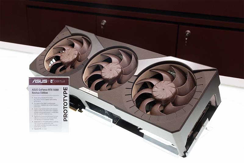 كُشف النقاب أيضًا عن بطاقة ASUS GeForce RTX 5080 Noctua Edition المرتقبة للغاية، والتي تتميز بثلاث مراوح NF-A12x25 G2 من الجيل التالي، مثبتة على مشتت حراري مصمم خصيصًا. يتضمن هذا التصميم حجرة بخار واسعة وأحد عشر أنبوبًا حراريًا، سبعة منها بقطر 8 مم وأربعة بقطر 6 مم. تعتمد لوحة الدوائر المطبوعة (PCB) على طراز TUF Gaming، ويعزز نظام التبريد المُحسّن كفاءة الأداء مقابل الضوضاء بشكل ملحوظ مقارنةً ببطاقات TUF Gaming وROG Astral. تشغل البطاقة 4 فتحات (80 مم)، بأبعاد 385 مم طولًا و151 مم عرضًا، ووزنها 2.6 كجم. من المتوقع إصدار بطاقة الرسومات في الربع الثالث من عام 2025.