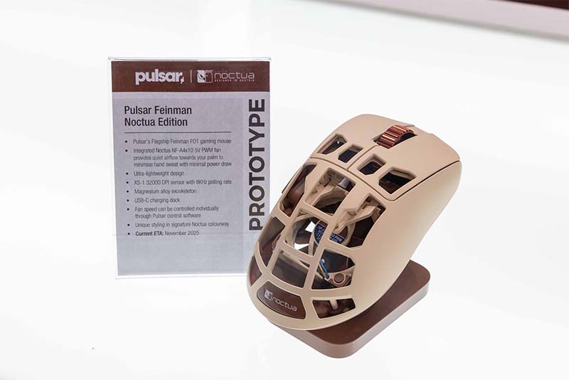 من أبرز المنتجات المعروضة مشروع التعاون المُخطط له مع شركة Pulsar، وهي علامة تجارية رائدة في مجال ملحقات الألعاب عالية الجودة ومشهورة في عالم الرياضات الإلكترونية. يتمحور المشروع حول فأرة الألعاب الرائدة Feinman FO1، التي تتميز بتصميم فائق الخفة، مصنوعة من هيكل خارجي من سبائك المغنيسيوم، وتحتوي على مستشعر XS-1 بدقة 32,000 نقطة في البوصة ومعدل استطلاع 8 كيلوهرتز. بالإضافة إلى التصميم الفريد بلون Noctua المميز، تتضمن الفأرة مروحة Noctua NF-A4x10 5V PWM عالية الكفاءة في استهلاك الطاقة، مما يوفر تدفقًا هادئًا للهواء إلى راحة اليد، ويقلل من تعرق اليد، ويحسن قبضة اليد أثناء جلسات اللعب المكثفة. من المتوقع إصدار الفأرة من Pulsar في نوفمبر 2025.