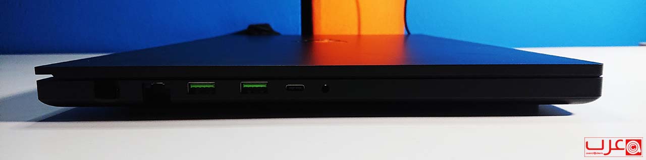 ويوجد على الجهة اليمنى منافذ USB من النوع A و Type C، بالإضافة إلى مخرج فيديو HDMI 2.1 لشاشة خارجية أو جهاز عرض. حتى أن Razer قامت بتثبيت فتحة بطاقة SD تدعم معيار UHS III ذو النطاق الترددي العالي، وهذا امر أقل شيوعًا في أجهزة الحاسب المحمولة الحديثة. ولا توجد منافذ أخرى على الجزء الخلفي أو الأمامي لـ Razer Blade 17.