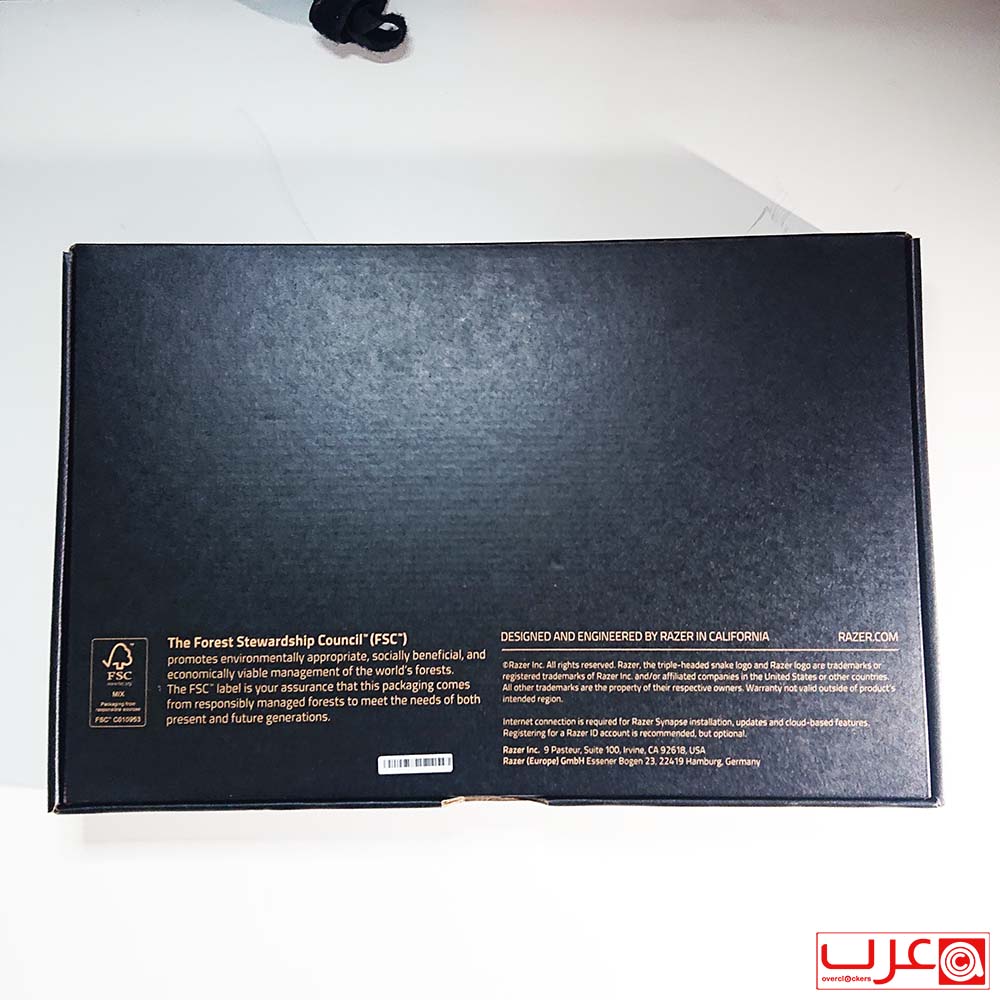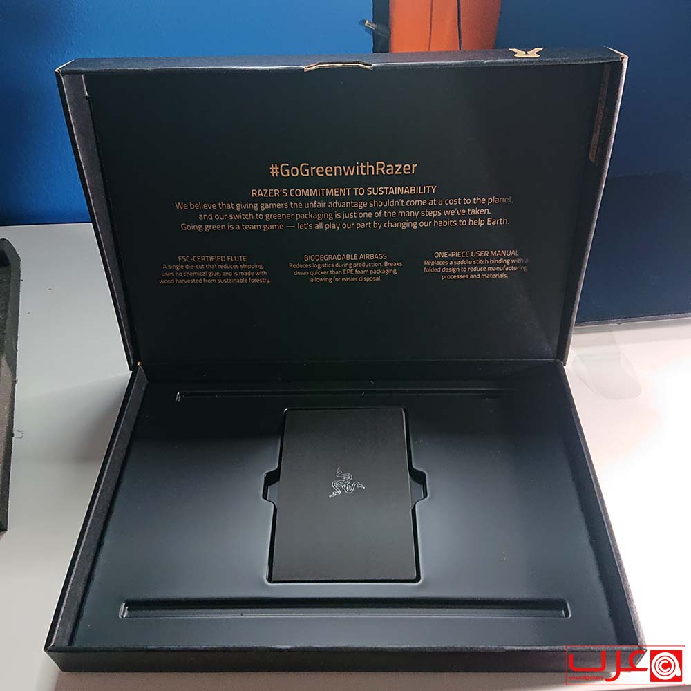 يأتي الحاسب داخل صندوق باللون الاسود محاط بالاكياس الهوائية لحمايته، وبداخل الصندوق هناك صندوق اصغر مزين بشعار Razer يحتوي على الحاسب، وبالاسفل نجد كتيب التشغيل السريع، وقطعة مخملية لمسح الشاشة، بالاضافى الى بعض الملصقات ورسالة من رئيس الشركة.