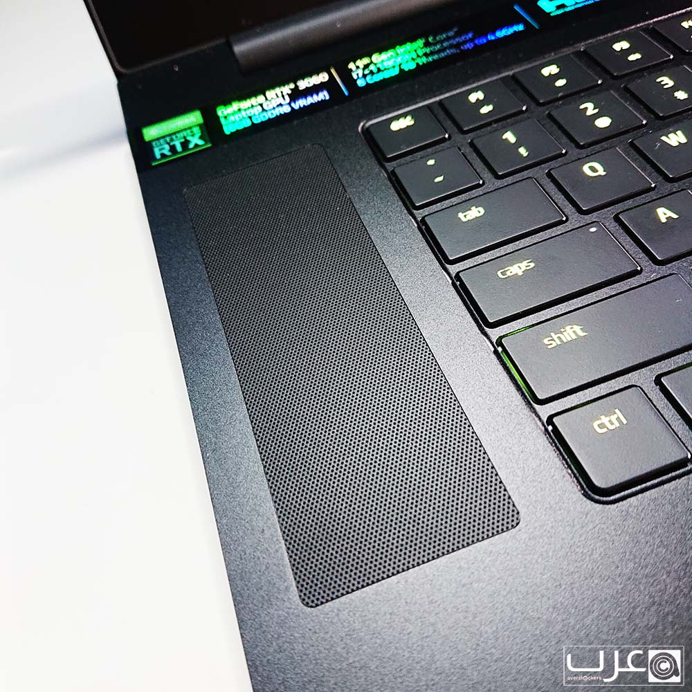 إحدى مزايا Razer Blade 17 هي لوحة اللمس الزجاجية الكبيرة، والتي تتميز بالدقة العالية. يتعرف بسهولة على إيماءات اللمس المتعدد مثل الحركة للداخل / التصغير للتكبير أو التمرير بإصبعين. لا تنخفض الدقة حتى عند حواف سطح اللمس. بالإضافة إلى ذلك تتميز لوحة اللمس بحجم مناسب يبلغ 130×80 ملم. ولا توجد أزرار بارزة مخصصة، فيجب النقر فوق المناطق المقابلة لذلك اسفل لوحة اللمس. وبشكل عام يمكن اعتبار لوحة اللمس هذه واحدة من أفضل لوحة اللمس في السوق، على الرغم من أن اللاعبين الطموحين يفضلون على الأرجح توصيل الفأرة.