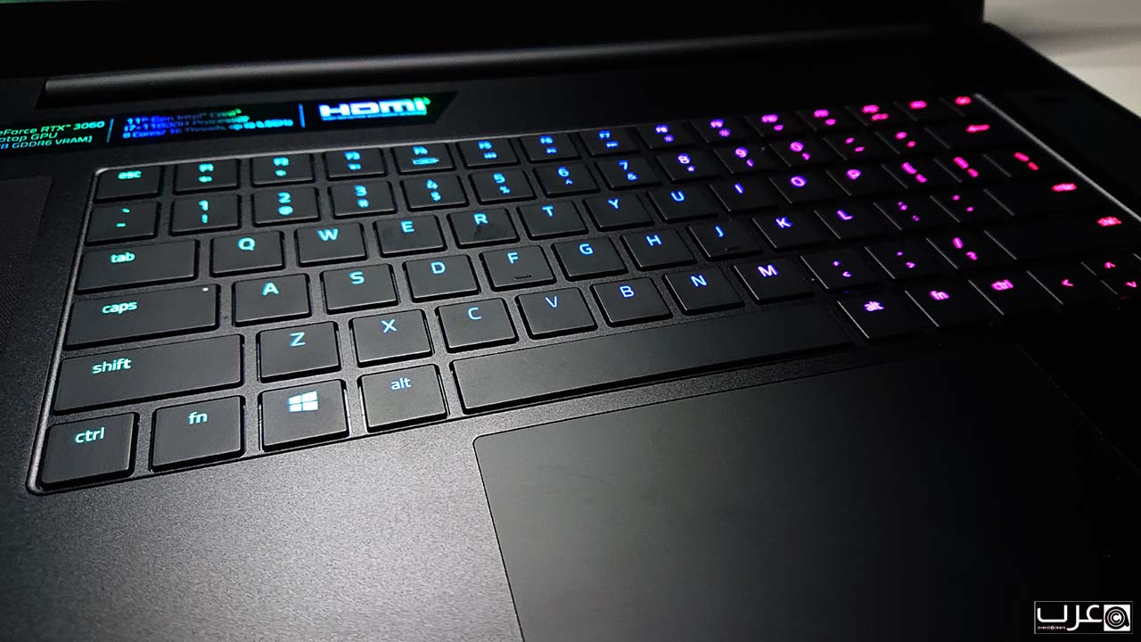 مع حاسب Blade Pro 17 من العام الماضي، تحولت Razer من لوحات المفاتيح الميكانيكية إلى لوحة مفاتيح عادية، والتي ورثها Razer Blade 17. الحروف البيضاء على أغطية المفاتيح السوداء متناقضة للغاية وسهلة القراءة. وللعمل أو اللعب في الظلام، ستكون إضاءة RGB مفيدة جدا. وهي موحدة ومشرقة، ويمكت تخصيصها باستخدام الأداة المساعدة Synapse الخاصة بالحاسب.
