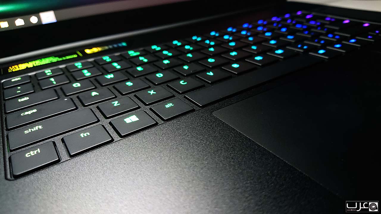 حجم المفاتيح كبير نسبيًا ويبلغ 16×16 مم، ونفصل بينها مسافة 3 مم. هذا الامر نموذجي تمام لفئة 17 بوصة. نقطة الضغط محسوسة بشكل جيد، ويتم الضغط على المفاتيح بسهولة شديدة. وفي العمل اليومي أو اللعب سوف يتناسبون دون مشاكل. ولا اعلم لماذا لم تضف Razer إطارًا رقميًا على الرغم من حجم الجهاز 17 بوصة. وعلى اليسار واليمين يمكنك رؤية مكبرات الصوت الكبيرة المعتمدة من THX (احدة شركات Razer)، ويمتلك الحاسب صوت عال ونقي ورائع مقارنة با حاسب محمول اخر. وسيقدر اللاعبون دعم مكافحة الظلال والماكرو بكل تأكيد.