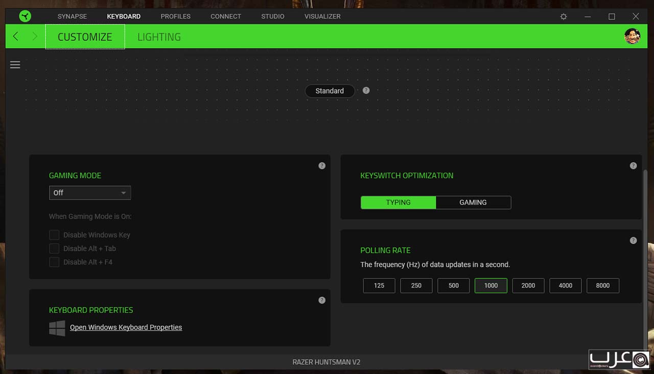 في الوقت نفسه، في علامة التبويب “التخصيص”، ستتمكن من إعادة برمجة أي مفتاح على لوحة المفاتيح وتعيين مفاتيح وظائف ثانوية عبر ميزة HyperShift من Razer. يمكنك أيضًا تعيين ملفات تعريف على اللوحة في علامة التبويب هذه، والتي تحتوي لوحة المفاتيح على أربعة منها. ضع في اعتبارك أنه لا يتم تعيين الملفات الشخصية تلقائيًا، لذا تأكد من القيام بذلك قبل الانتقال إلى إعداد آخر. ولكن بغض النظر عن المكان الذي تذهب إليه، ستحتاج إلى فتح برنامج Razer Synapse لرؤية تأثيرات الإضاءة المخصصة كل مرة. وفي الجزء السفلي من هذا القسم، ستجد إعدادات Key Switch Optimization وإعدادات معدل الاستقصاء “الاقتراع”، والتي تتيح لك الاختيار بين 125 هرتز و 250 هرتز و 500 هرتز و 1000 هرتز و 2000 هرتز و 4000 هرتز و 8000 هرتز.