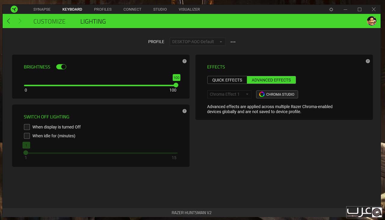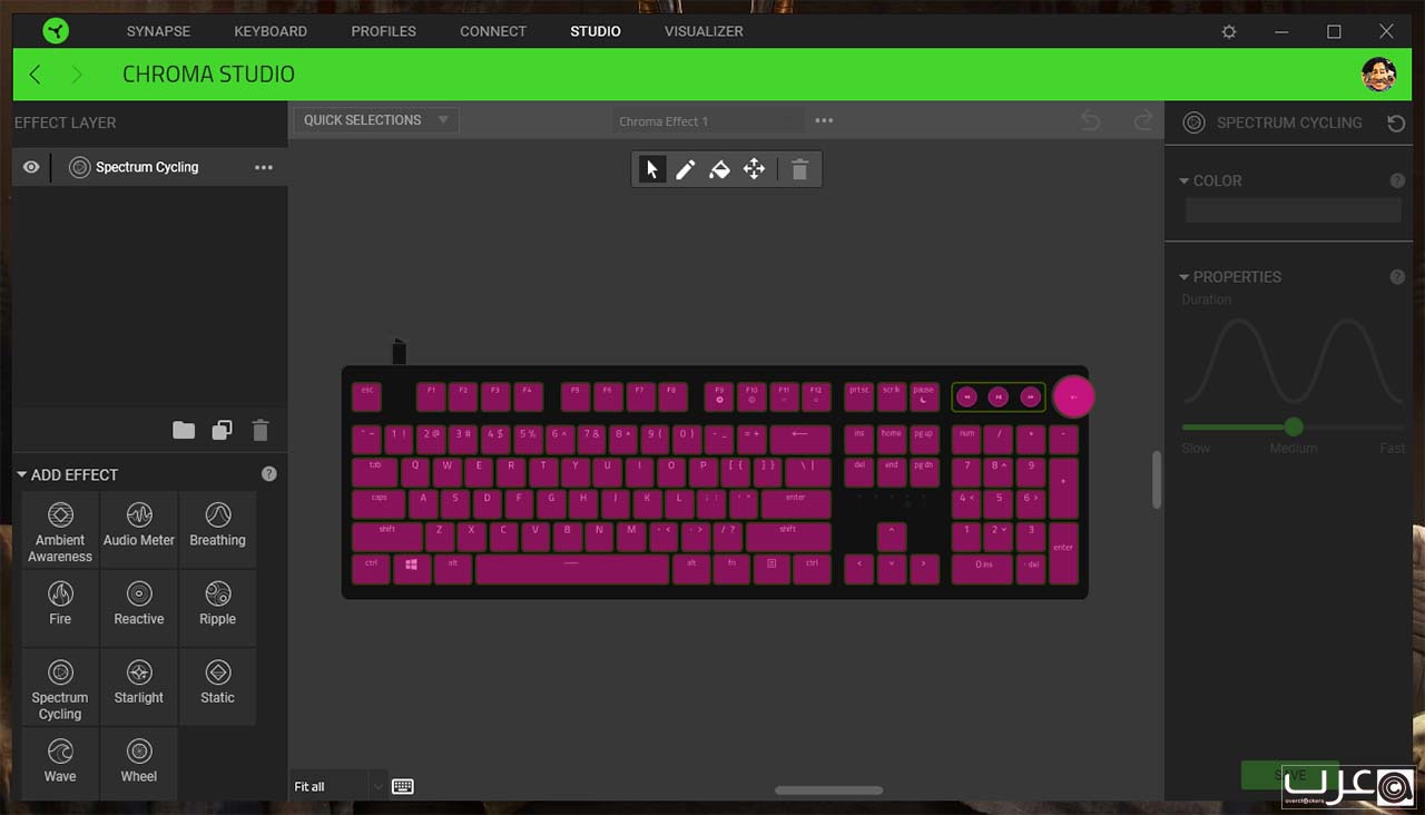 ولحسن الحظ، تعد لوحات المفاتيح في التعامل مع البرنامج أبسط من الفأرات من حيث أنها تحتوي على علامتي تبويب فقط داخل البرنامج، التخصيص والإضاءة. في قسم الإضاءة، يمكنك الوصول إلى إعدادات السطوع الأساسية وبعض التأثيرات السريعة مثل الموجة أو التموج. ويمكنك الغوص في التأثيرات الأكثر تقدمًا في Chroma Studio. حيث سمح لي هذا باستخدام تأثير الموجة العادي، ولكن بسرعة أبطأ كثيرًا ، لأنه التأثير سريع بشكل غريب في إصدار Quick Effect. ويمكنك حتى الذهاب إلى أبعد من ذلك لإعطاء كل مفتاح فردي تأثيره الخاص.