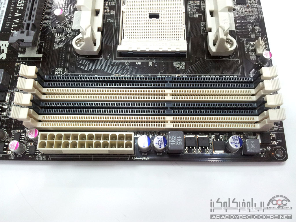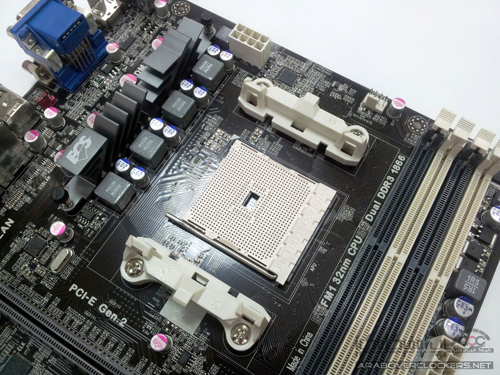 نرى هنا منطقة مقبس المعالج المسمى FM1 ويشتهر هذا المقبس أيضا بأسم A75 وتدعم اللوحة معالجات حتى 100W TDP