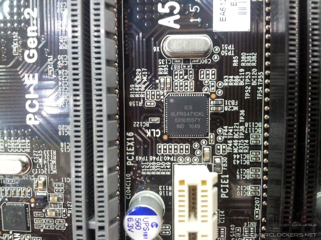 أسفل مقبس PCI-E الأول نرى المتحكم ICS 9LPRS471CKL وهو الخاص بالتحكم بالساعة في اللوحة ويليه مباشرة بالمقبس التالي نرى بطارية اللوحة
