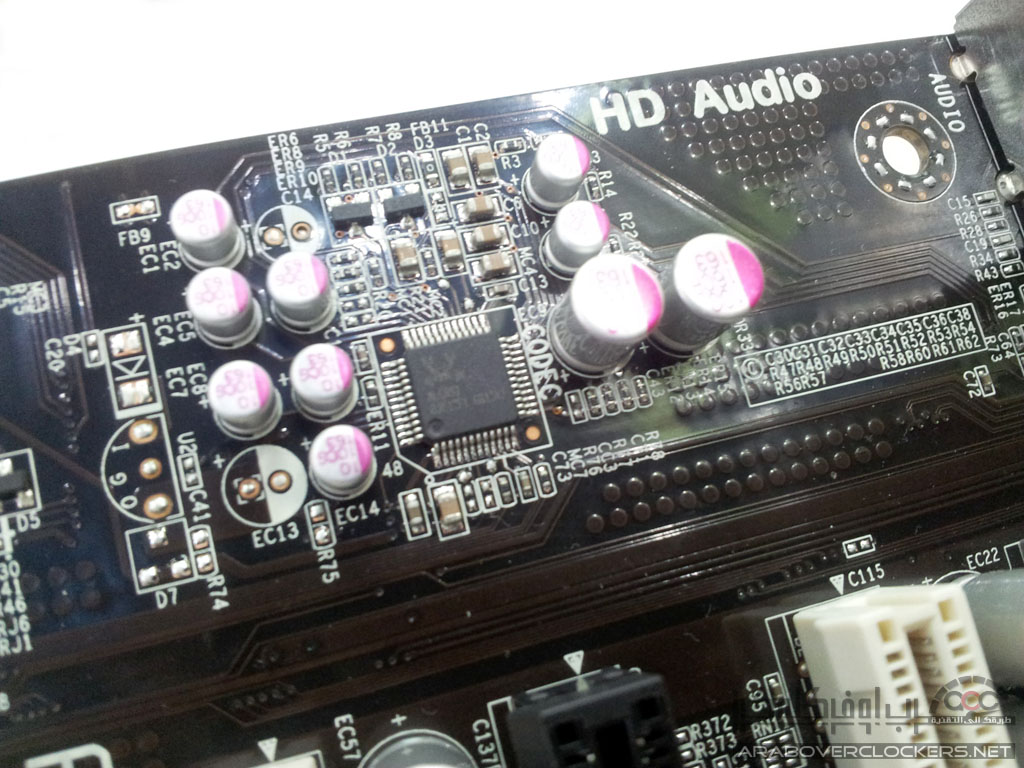 نجد بجوار مقبس PCI-e الأسود شريحة الصوت المدمجة ALC892 من شركة Realtek والمتوافقة مع 8CH HD audio specification