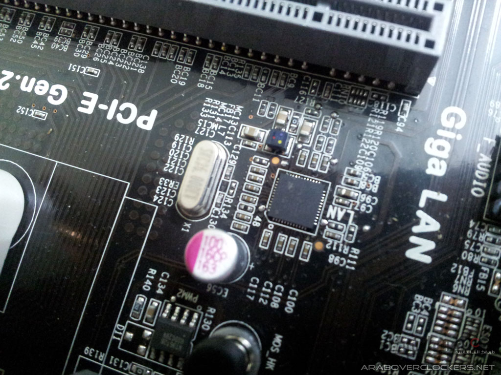 نرى فوق أول مقبس PCI-E شريحة RTL8111E من شركة Realtek وهي المتحكم في وحدة LAN