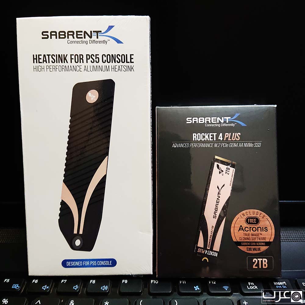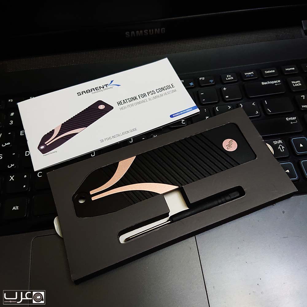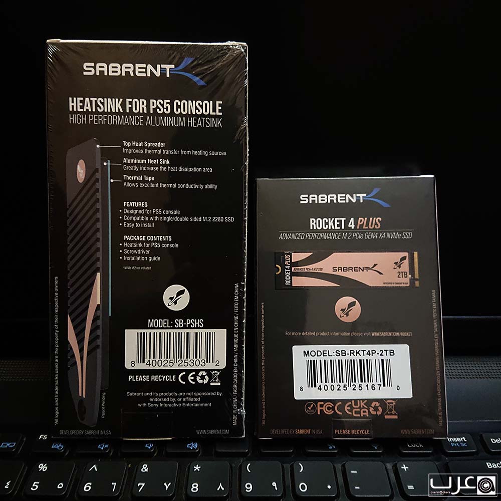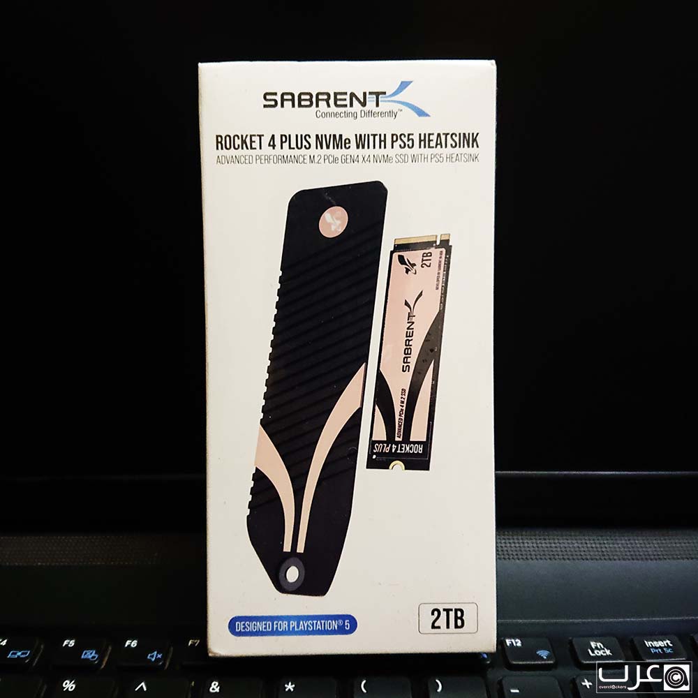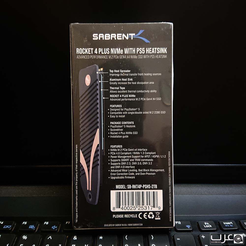 يوضح الجزء الأمامي بوضوح سعة القرص مع الموديل بالكامل وصورة للقرص مع مشتت PS5 المرفق. ويحمل التغليف شعار SABRENT مع الاشارة ان هذا الاصدار مصمم ليتوافق مع منصة العاب PS5.
