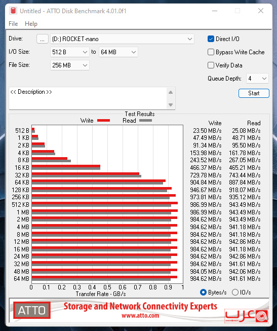 للاختبار، سوف نستخدم Rocket Nano على منصة Z690، المتصل عبر USB 3.2 Gen 2×2 بالطبع. ضع في اعتبارك أن Sabrent تعلن عن محرك الأقراص هذا بسرعات تصل الى 1000 ميجابايت/ثانية للكتابة وقراءة 1000 ميجابايت/ثانية.
