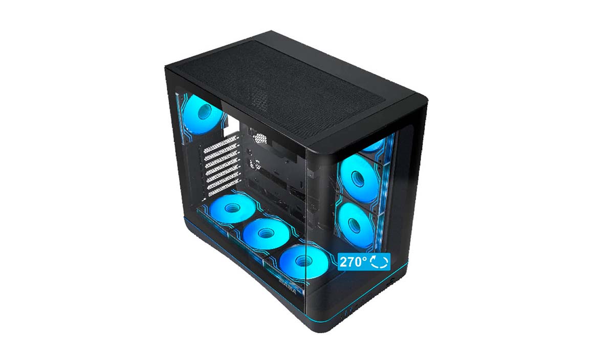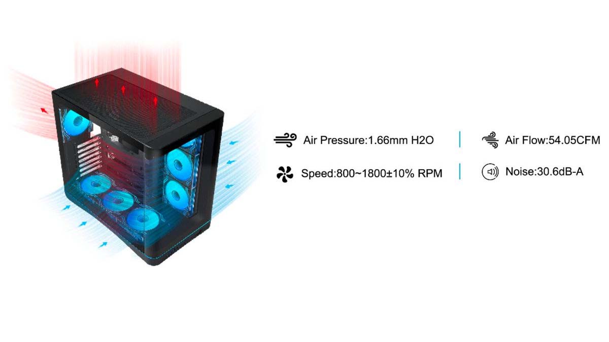 يتضمن الصندوق سبع مراوح ARGB مثبتة مسبقاً توفر تدفق هواء فعالاً وإضاءة متناسقة دون الحاجة إلى شراء ملحقات إضافية. كما تتميز كل مروحة بتأثير المرآة اللانهائية (Infinity Mirror) الذي يضيف عمقاً بصرياً وحركة ديناميكية للإضاءة مع الحفاظ على مظهر منظم داخل الصندوق.