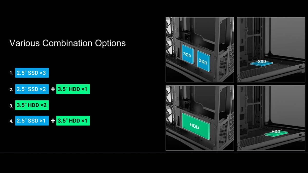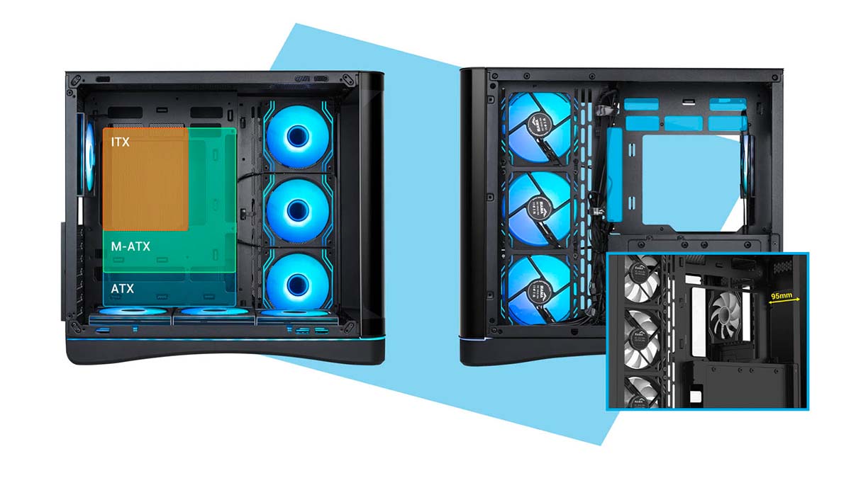 كما يوفر الصندوق مساحة 95 ملم لإدارة الكابلات خلف لوحة الأم، ما يسهل الحفاظ على مظهر داخلي نظيف ومنظم. ويدعم كذلك تركيب قرصي HDD وثلاث وحدات SSD لتوفير خيارات تخزين عملية دون إحداث فوضى داخل الهيكل.