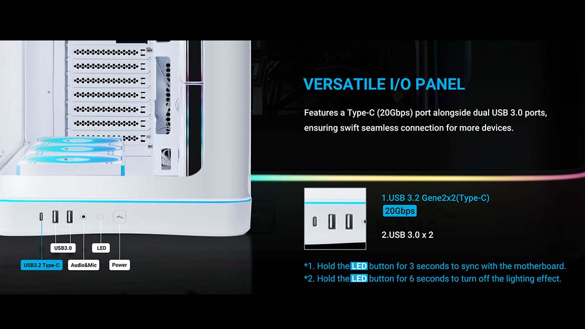 وفي أسفل الهيكل، يضم الصندوق شريط إضاءة ARGB مدمج يمنح توهجاً خفيفاً يمتد خارج الصندوق، مما يساعد على إبراز النظام فوق المكتب دون أن يطغى على التصميم العام.