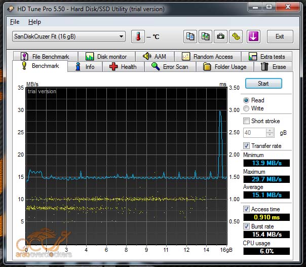 وصل متوسط سرعة قرائة البيانات ذاكرة فلاش SanDisk Cruzer Fit الى 15.1 ميجابايت/الثانية مع زمن وصول وقدره 0.910 ms وكما نلاحظ في الصورة ادناه، اما عن تذبذب الاداء فهو امر طبيعي مع ذواكر الفلاش.