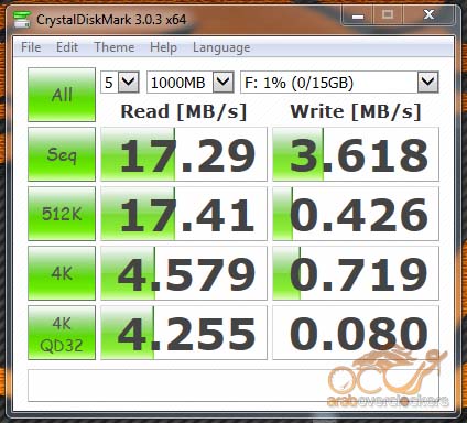 لاختبار الاول تم نقل ملف ISO بحجم 3.67 جيجا الى ذاكرة فلاش SanDisk Cruzer Fit وكان معدل النقل 17.2 ميجابايت/الثانية