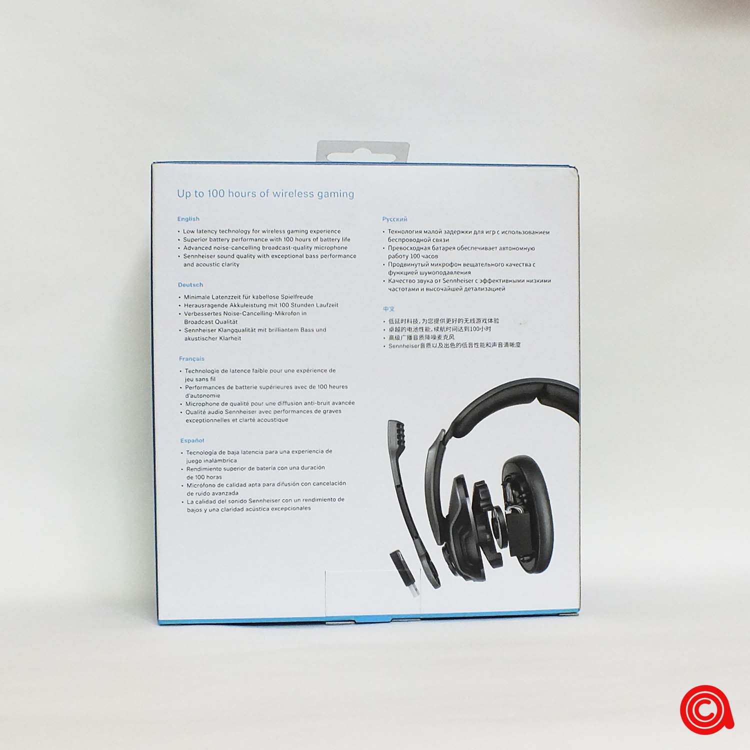 على الجزء الخلفي من الصندوق، لدينا قائمة ميزات بلغات مختلفة بالإضافة إلى صورة لمكونات سماعة الرأس على شكل طبقات.
