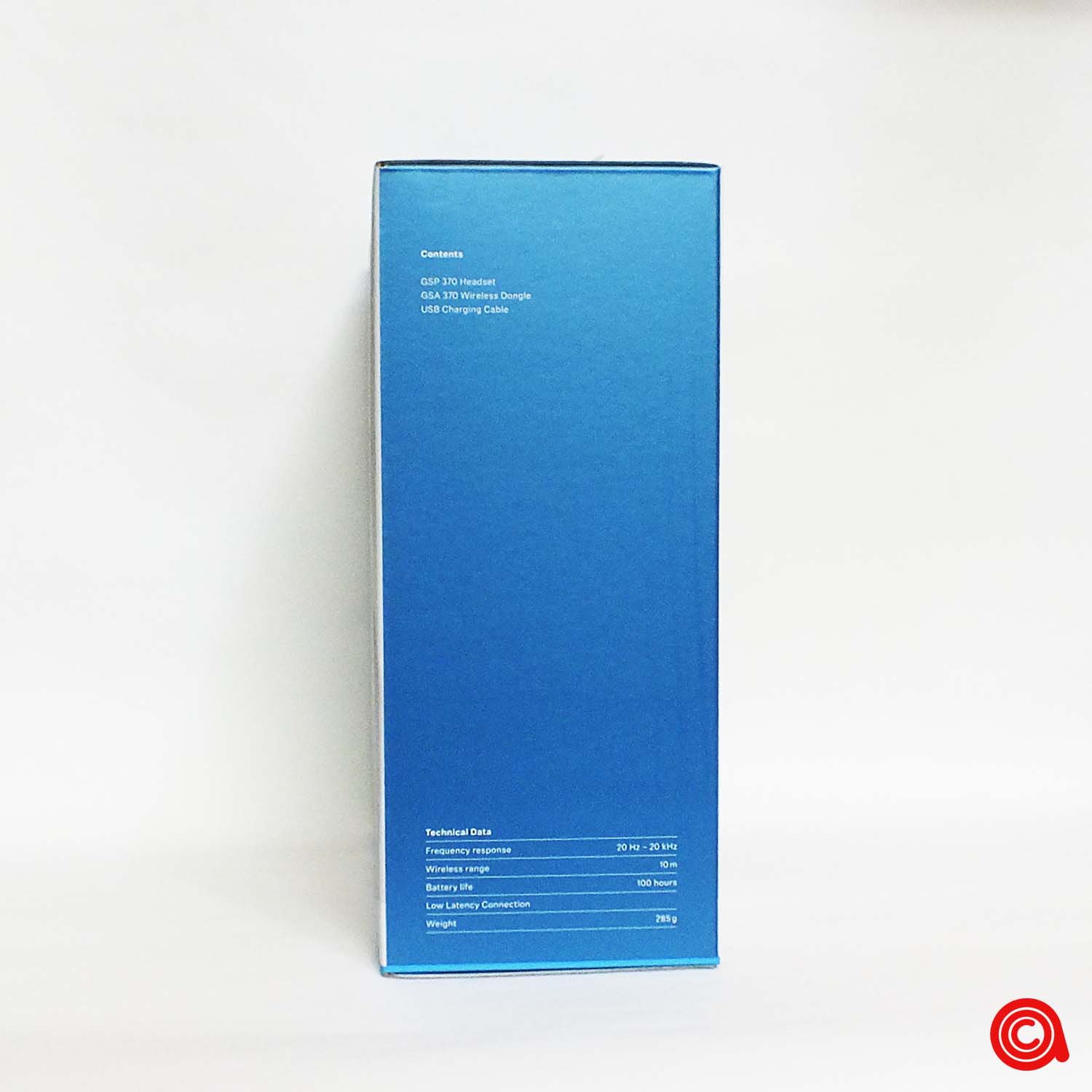 على الجزء الأمامي من الصندوق، نحصل على صورة جانبية لسماعات الرأس، إلى جانب بعض الرسوم الضبابية التي توضح ان السماعة تعمل لمدة 100 ساعة في الوضع اللاسلكي، بالاضافة الى ومن تأخير قليل عن التوصيل.