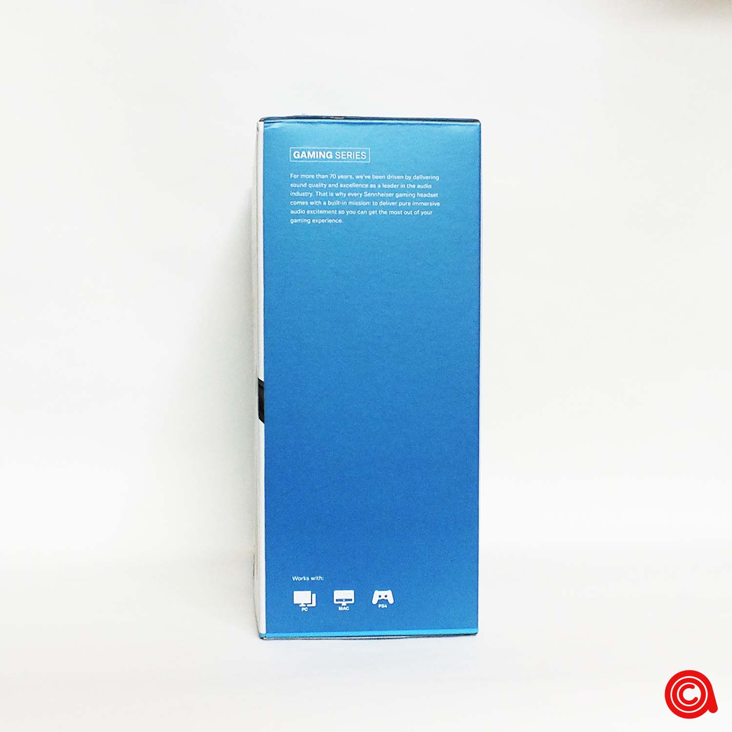 على الجانب الأيمن من الصندوق، نجد وصف سريع لسماعات الالعاب من الشركة، مع ذكر التوافق مع الحواسيب بنظامي وندوز و Mac OS بالاضافة الى منصة PlayStation.