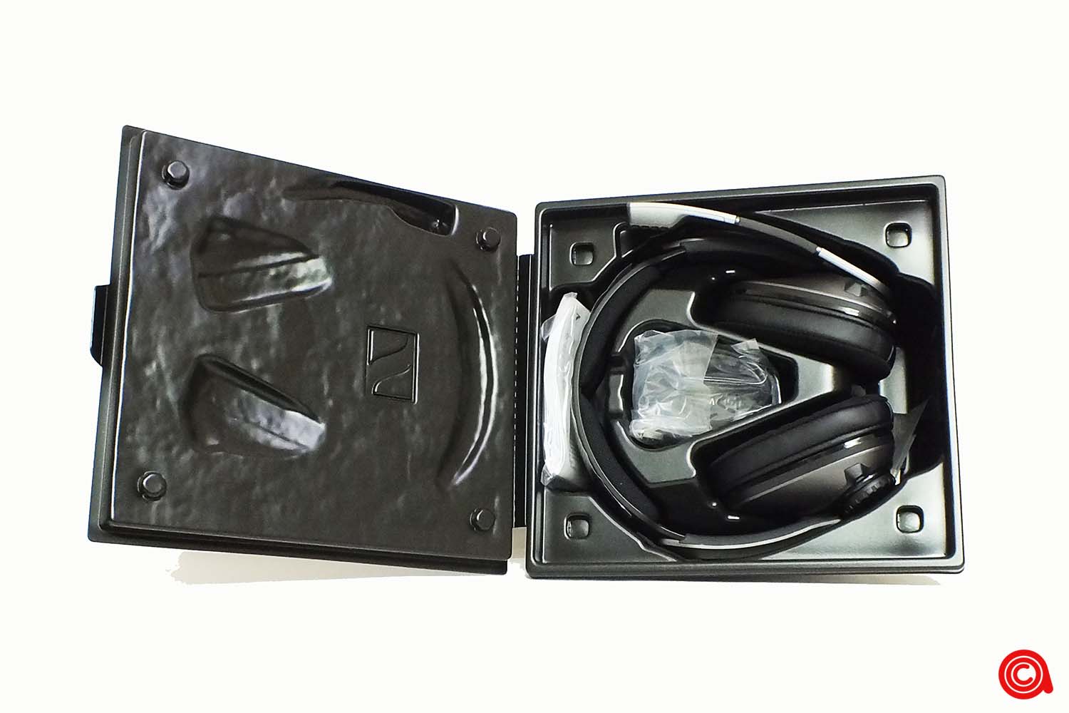 عند رفع الغطاء عن الصندوق، نجد انه يتم تثبيت سماعات الرأس في مكانها بواسطة العبوة من البلاستيك المرن من قطعتان، لاغلاق الاحكام على السماعة.