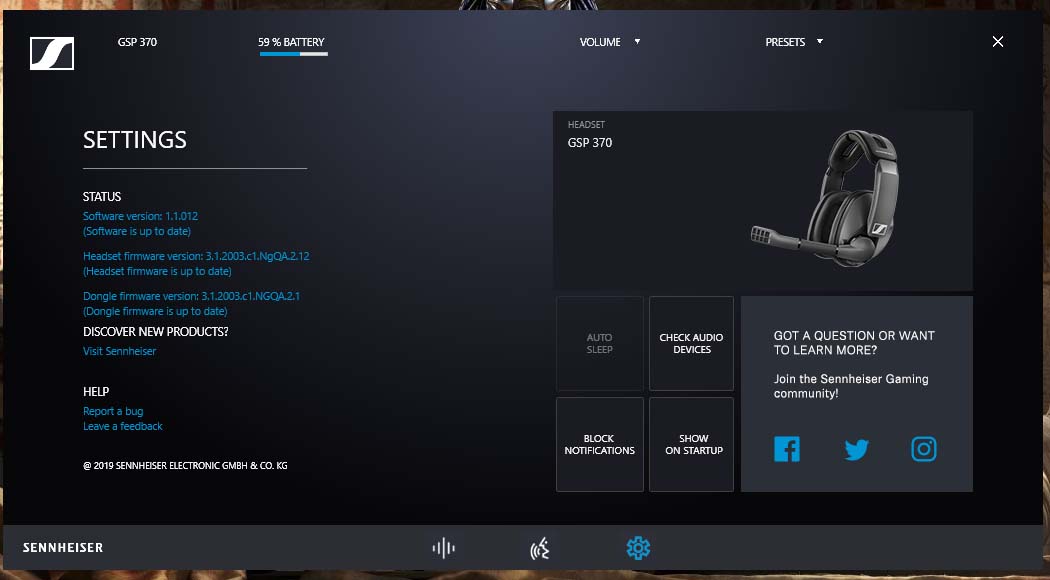في علامة التبويب الثالثة والأخيرة هناك خيارات لتحديث البرامج الثابت لسماعات الرأس والدونجل، وهناك أيضًا وضع تبديل السيات التلقائي والإعداد وحظر الإخطارات وخيار تشغيل البرنامج عند بدء التشغيل. يمكنك أيضًا تغيير الزر القابل للبرمجة من هذه الشاشة.