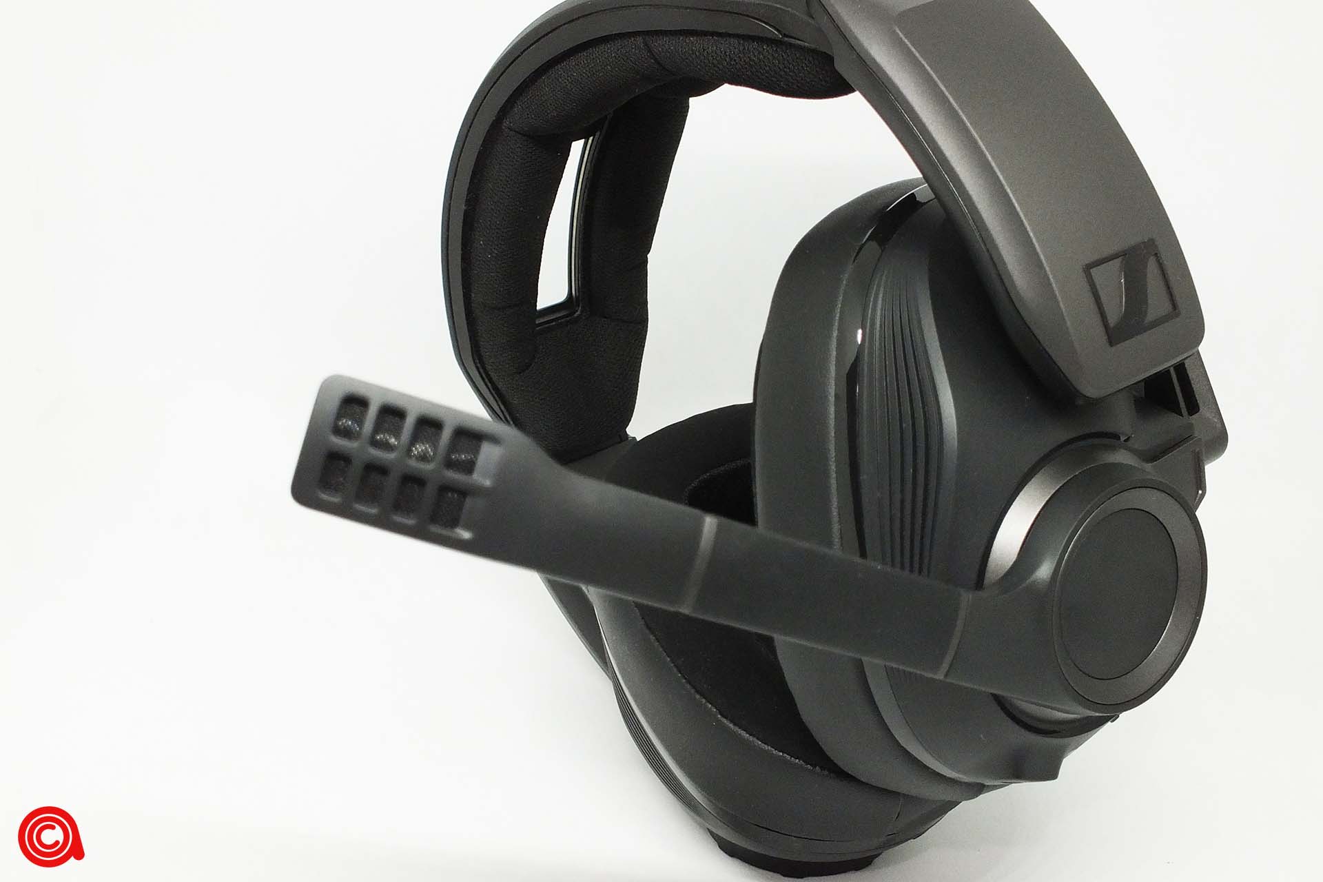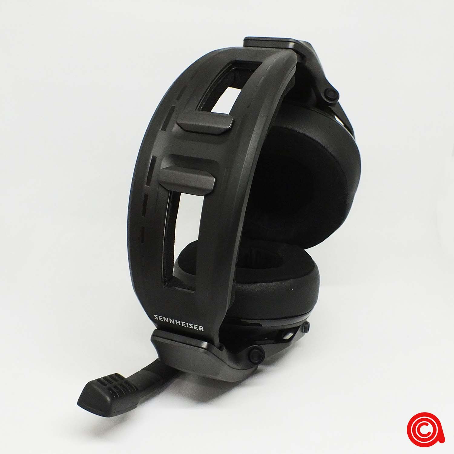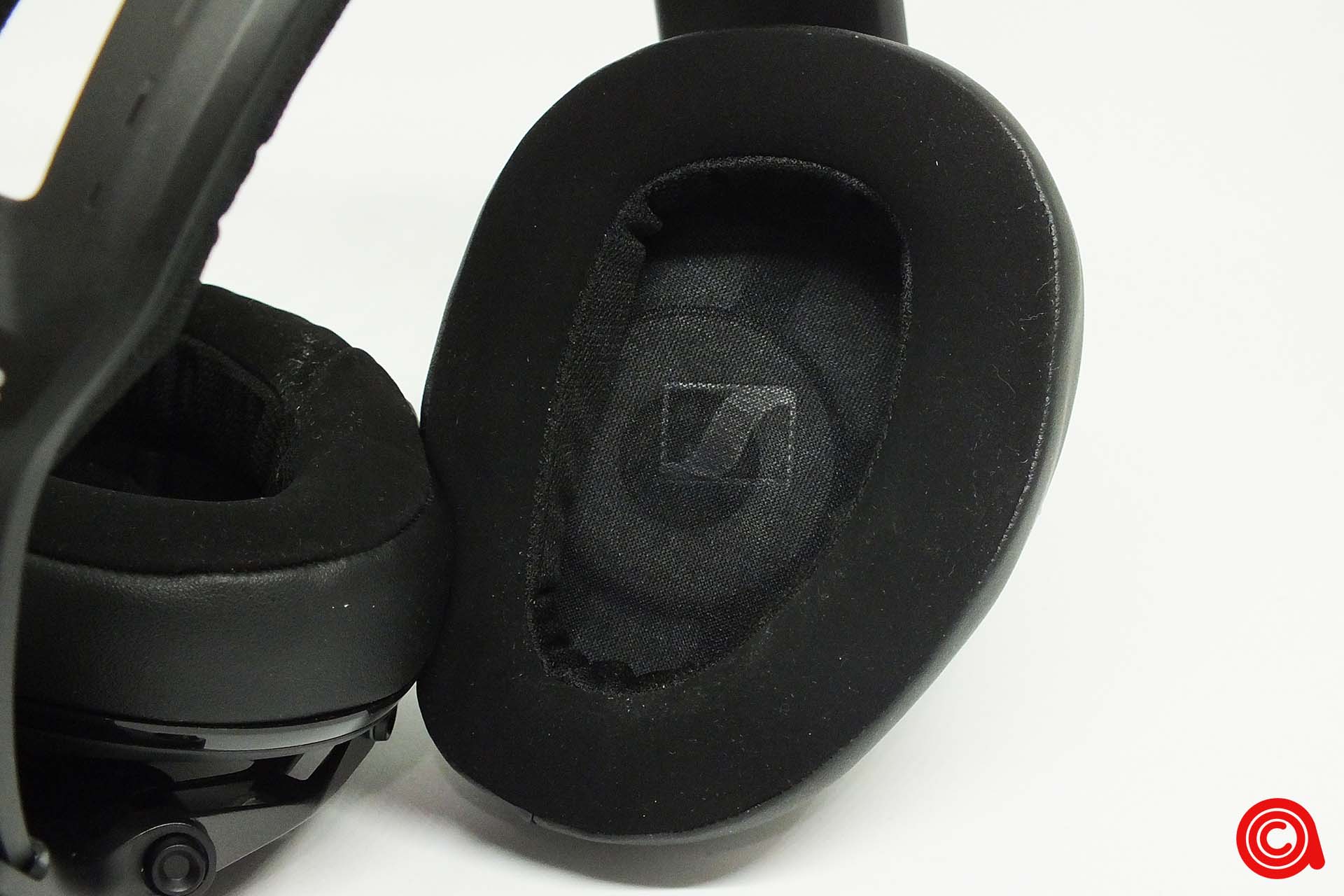 بألقِاء نظرة فاحصة على وسادئد الأذن، يمكننا أن نرى أنها مصنوعة من جلد ناعم وحواف بشكل مريح للمساعدة في عزل الضوضاء والراحة. الجزء الداخلي من وسادة الأذن الذي يلامس أذنك هو مادة تشبه الجلد المدبوغ تتميز باليونة ومريحة للغاية على أذنك. ونرى اضافة مميزة وهي شعار Sennheiser على المادة التي تغطي المشغل.