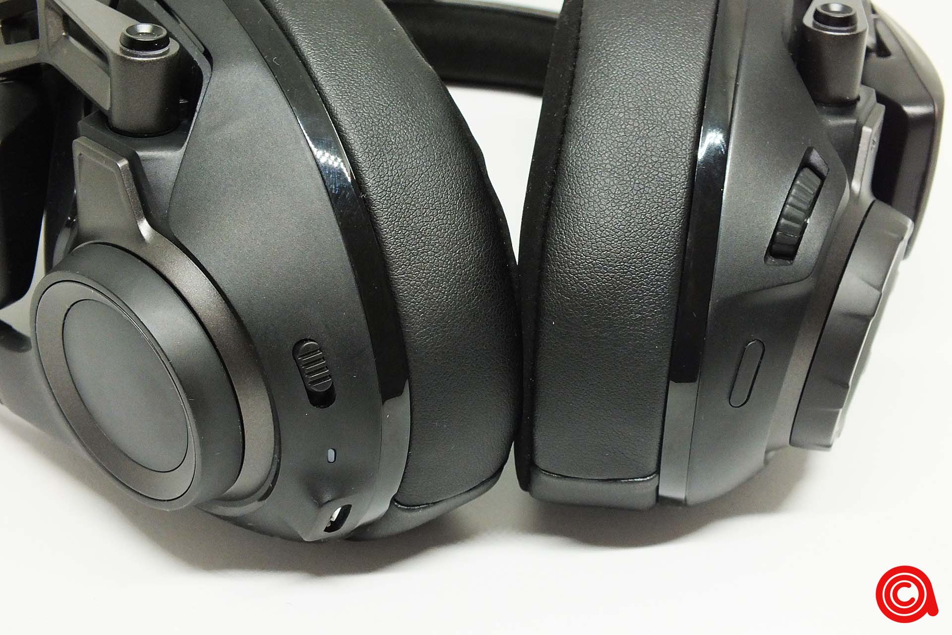 بدءًا من الجزء السفلي من سماعات الرأس وعلى وسادة الأذن اليسرى، لدينا منفذ USB سريع الشحن، جنبًا إلى جنب مع زر تمكين الاقتران. على وسادة الأذن اليمنى يوجد زر ذكي قابل للبرمجة بالإضافة إلى عجلة للتحكم في مستوى صوت الدردشة وعجلة اخرى على جانب وسادة الأذن تتحكم في الصوت.