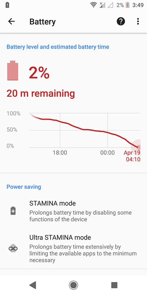 يأتي هاتف XZ2 ببطارية بقدرة 3180 ملي/امبير (واخيرا فعلتها سوني)، ولن اتحدث كثيرا عن ادائها فيكفي ما قلنا في مراجعتنا لاجهزة سوني السابقة، فالهاتف سيصمد معك لاكثر من 15 ساعة على الاقل من الاستخدام المتواصل للمهام مثل فحص رسائل البريد الإلكتروني، وسائل التواصل الاجتماعية، والرسائل النصية، وتصفح الإنترنت أو يوتيوب من خلال شبكات WiFi او الجيل الرابع LTE كل هذا مع 6 ساعات واكثر لوضعية عمل الشاشة (هذا اذا كنت من المستخدمين غير العاديين بالمرة)، وهذا بفضل الاستخدام المنخفض للطاقة في معالج Snapdragon 845 بالاضافة الى تنظيم استخدام الطاقة من سونى، ويمكن زيادة عمر البطارية اذا كنت بعيدا عن مكان شحن الهاتف بفضل خاصية STAMINA Mode الشهيرة من سوني.