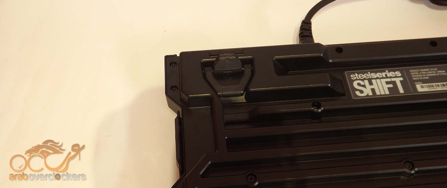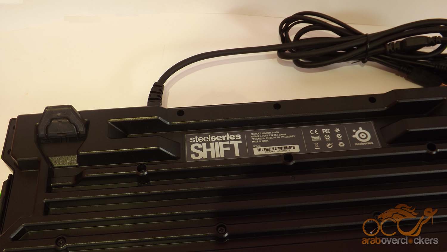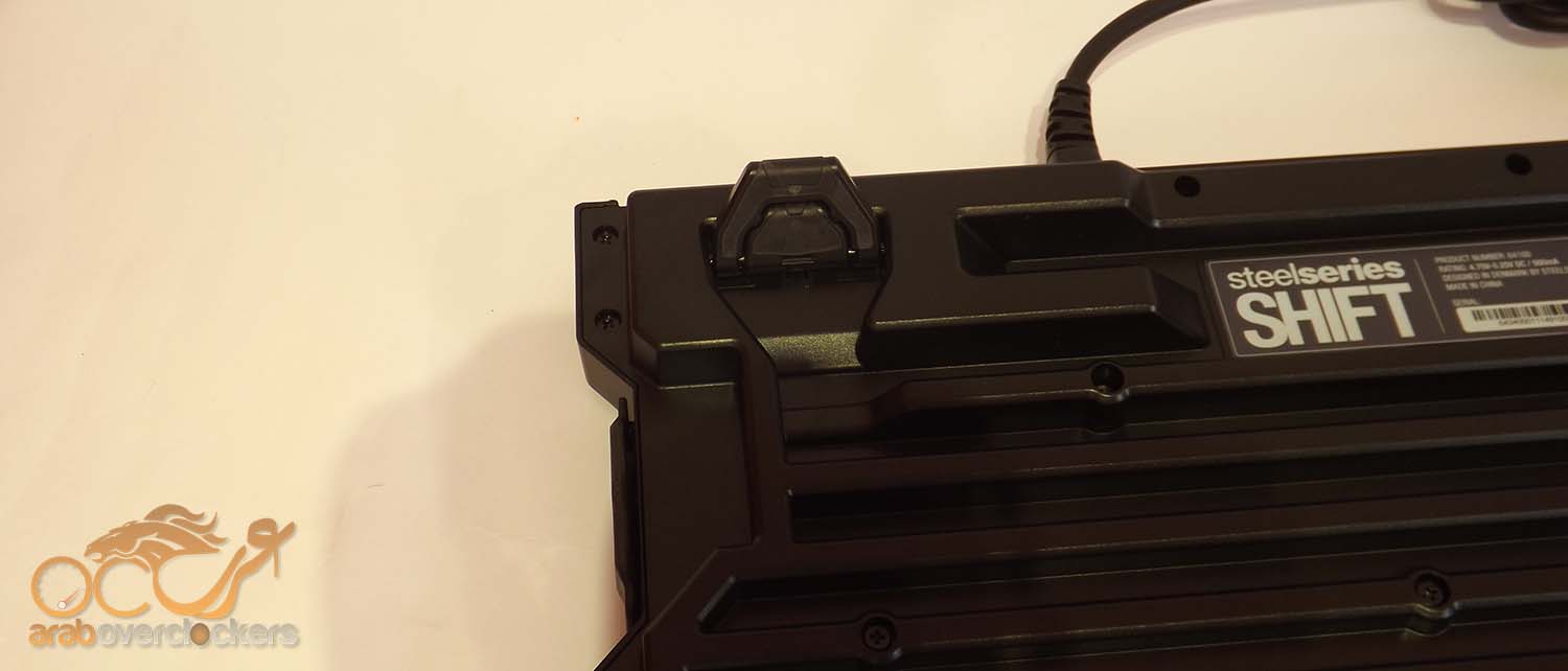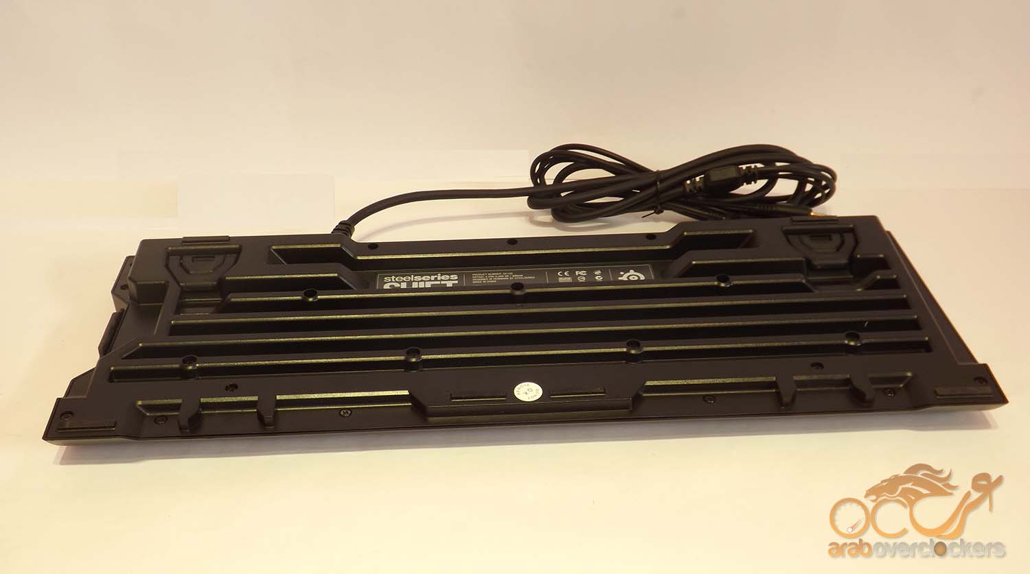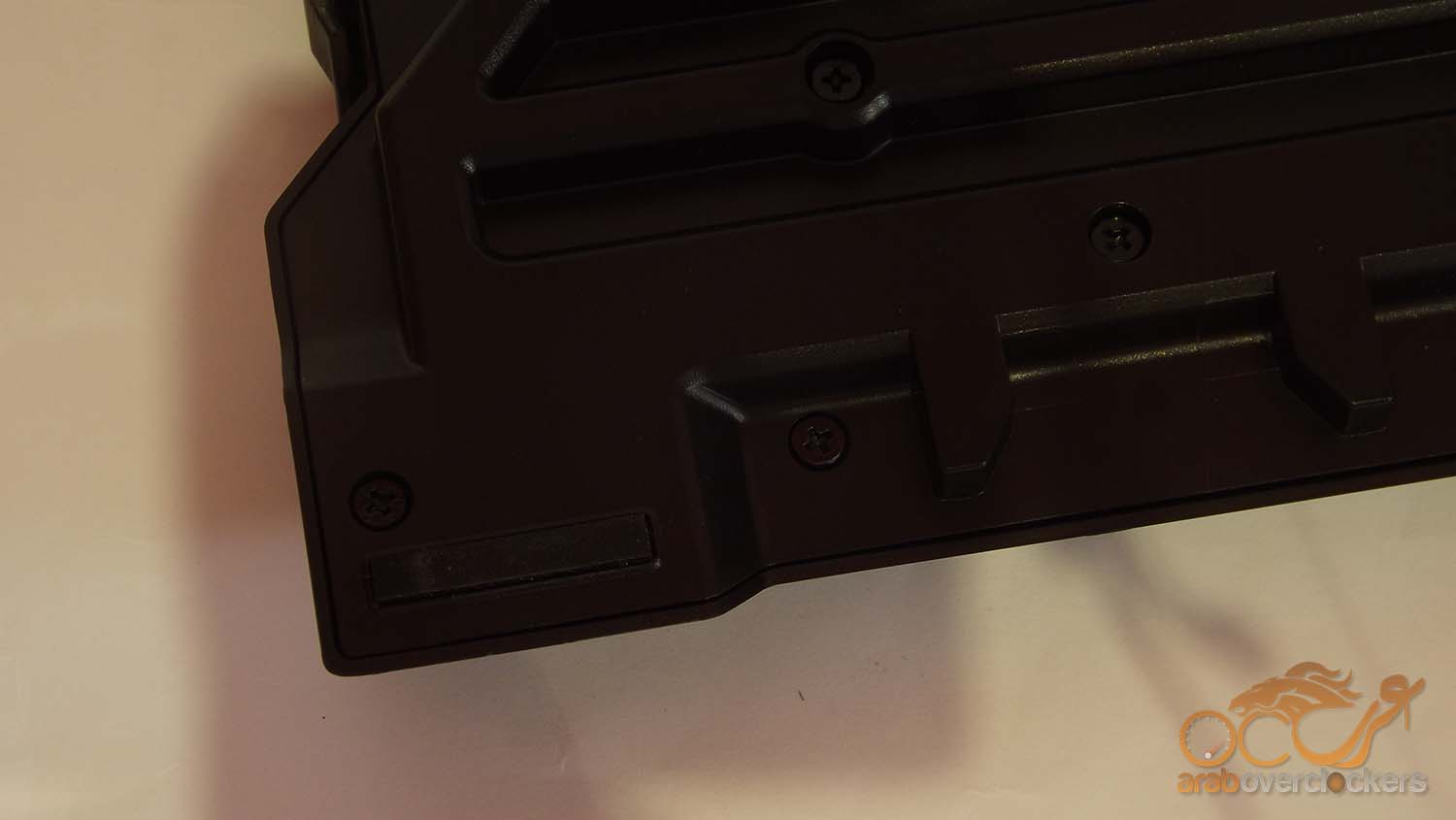 لا شئ بالأسفل سوي ملصق ببعض بيانات لوحة المفاتيح والرقم التسلسلي الخاص بها. كما نري إحدي القاعدتين المطاطتين الخاصتين بضبط مستوي إرتفاع اللوحة.