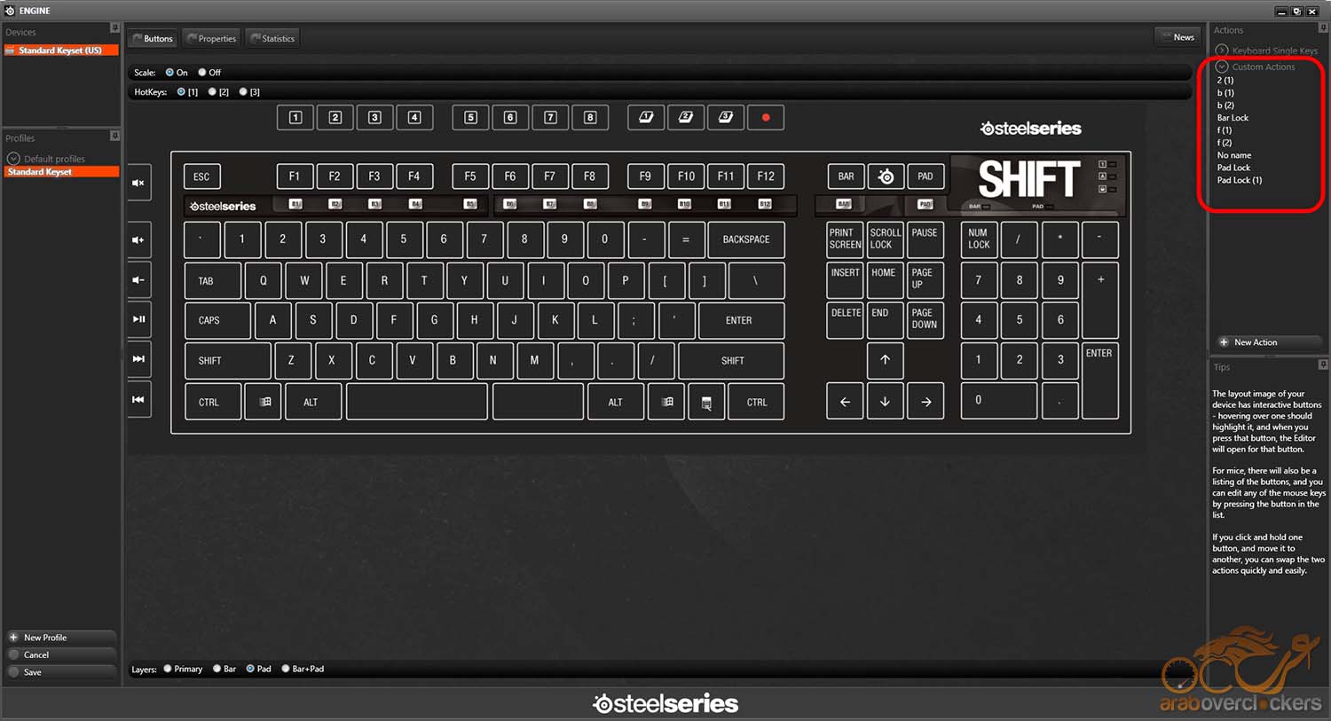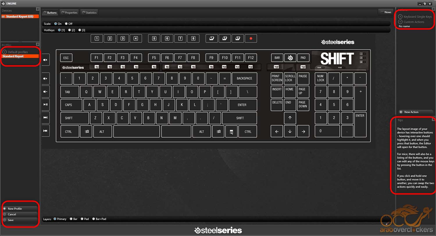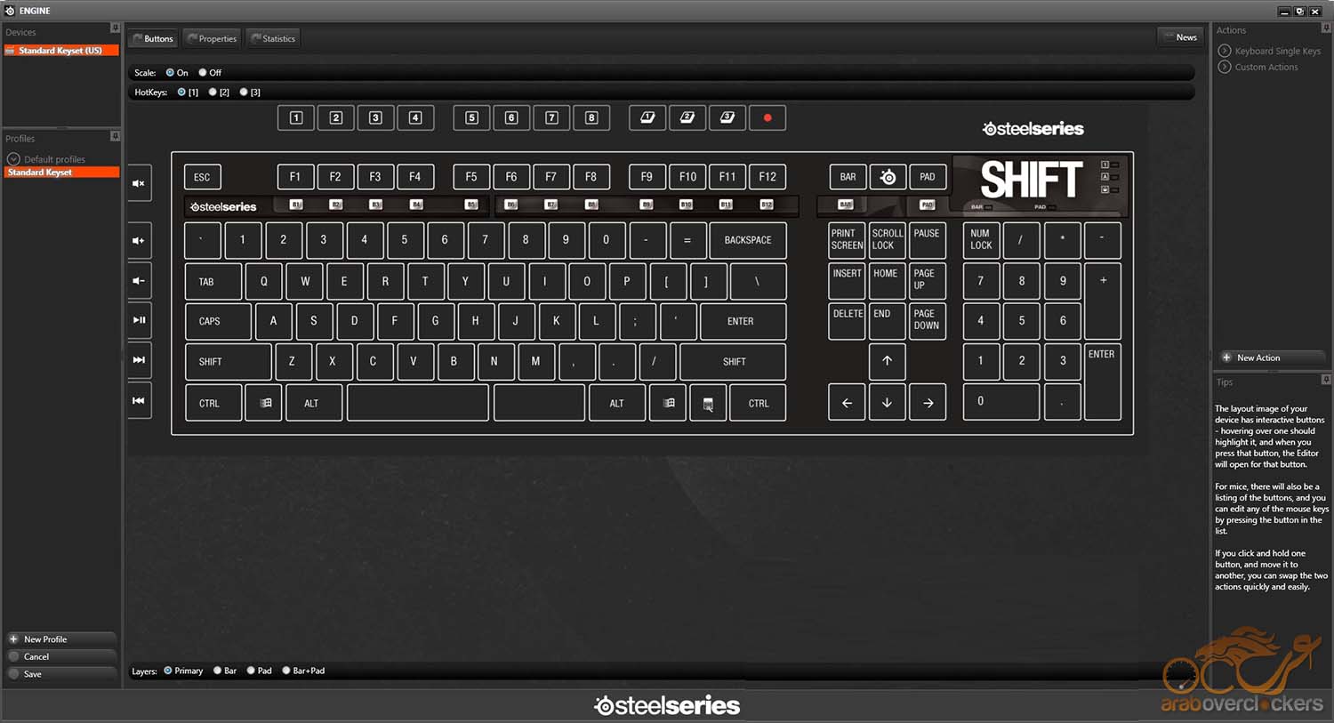 أسفلها نجد جزء خاص بـTips أو بالأرشادات الصغيرة التي تتغير طبقاً للجزء المُشار إليه فيعطيك تعريفاً مُبسطاً للجزء من البرنامج الذي تستخدمة وهي هنا توضح قدرات الشكل التفاعلي الموجود أمامك في أنك تستطيع وبكل سهولة الضغط علي الزر المراد التعديل عليه ثم إجراء التعديل أو حتي بالضغط والسحب لتبديل وظيفة أي زرين معاً بطريقة Swap.