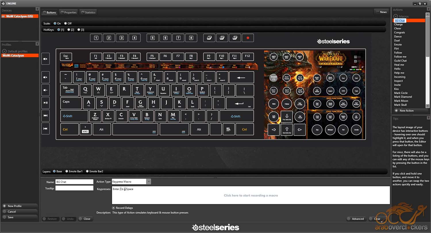 بمجرد توصيل الطاقم تصبح اللوحة جاهزة للعبة WOW ولا يمكن استخدام أغلب أزراره حال أردت متابعة عملة أو لعبة أي لعبة أخري. تأتي اللوحة محملة بعدد كبير من أزرار MACRO المُعدة مسبقاً لتتوافق مع اللعبة وخياراتها. والشكل علي اليمين يوضح مثلاً زر BG Chat وكيف أنه عبارة عن مجموعة من الأوامر المركبة في شكل زر MACRO.