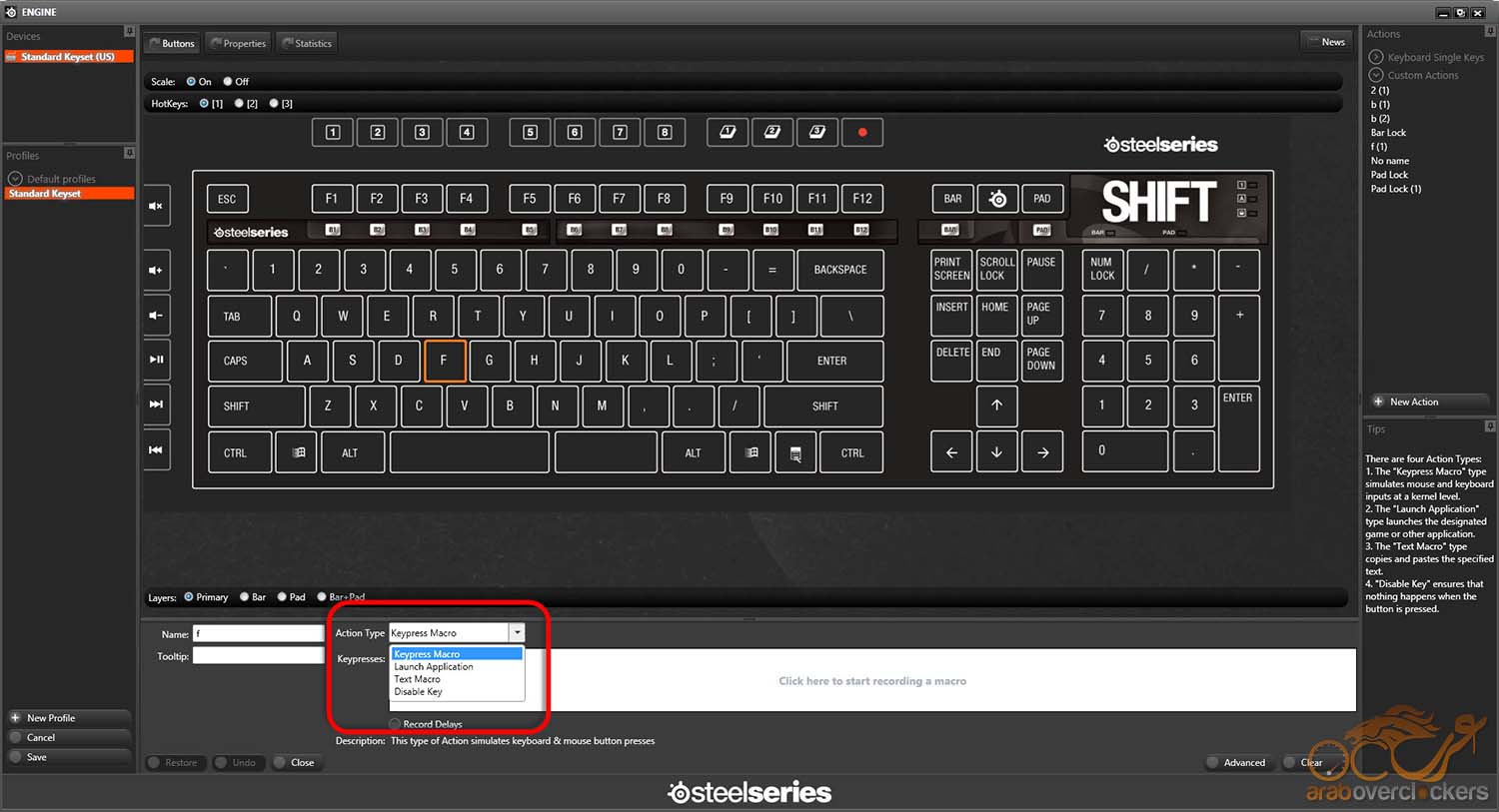 يمكن كما نري أن نحول الزر العادي الخاص بحرف F مثلاً إلي زر Macro أو نجعلة خاص بتشغيل أحد البرامج حال اخترنا Launch Application أو جعلها تنفذ Macro كتابي كأن نضغط علي الزر فيكتب تلقائياً “بسم الله الرحمن الرحيم” أو حتي يمكن إيقاف تفعيل الزر نهائياً Disable Key واراه مفيد لغلق تفعيل زري Win علي جانبي زر Space نهائياً والتعويض عن نسيان الشركة وضع أي زر يمكن إيقاف تفعيله مثلما فعلت Gigabyte ف OSMIUM.