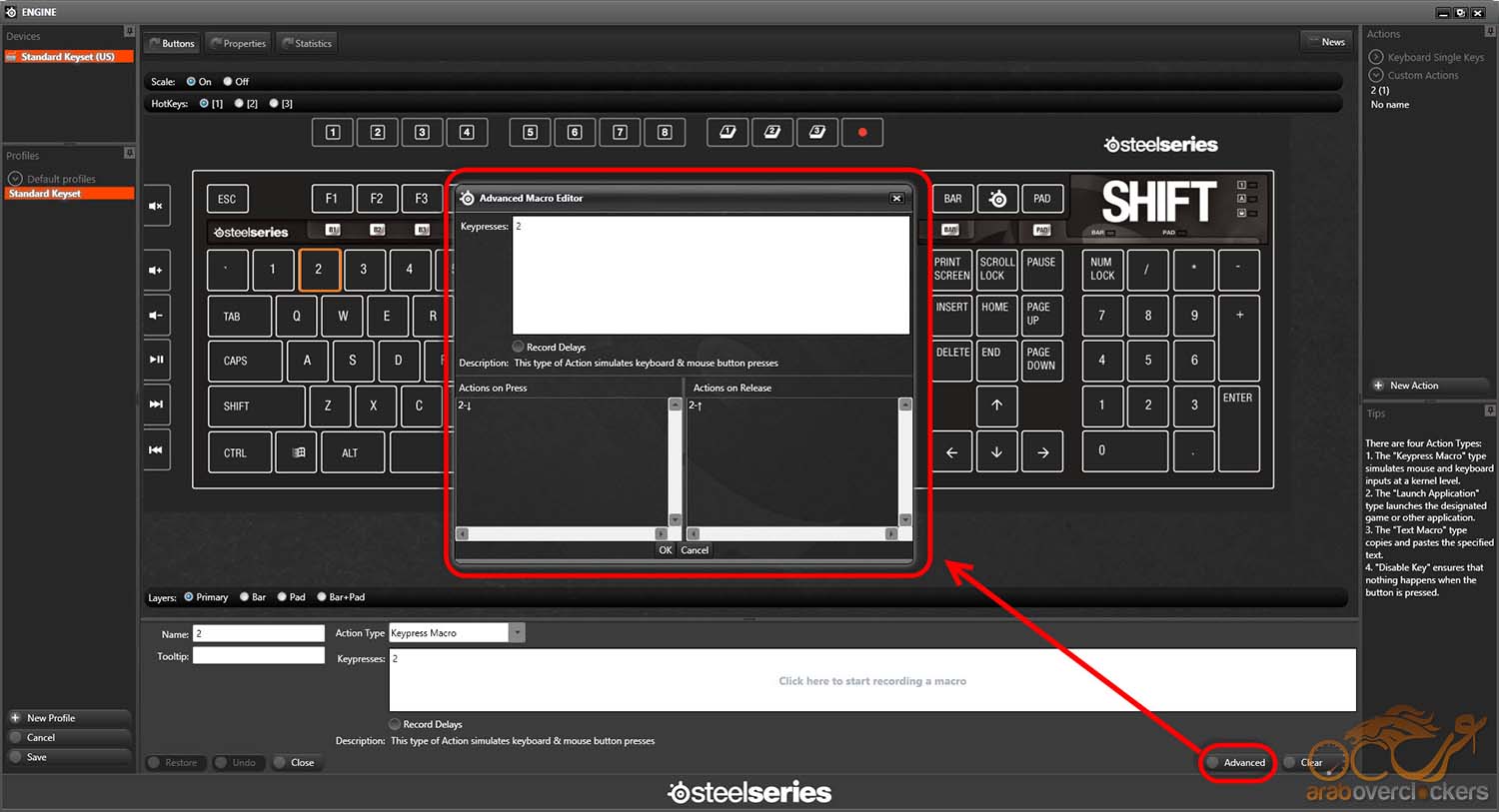 في حالة إختيار خيار MACRO فقط يظهر لنا خيار Advanced وكما نري يتيح شئ إضافي وهو تسجيل أوامر تتم تنفيذها عند الضغط علي الزر Action On Press وكذلك أخري تنفذ بمجرد ترك الزر Action On Relese بمعني أن يتم تنفيذ أمرين أحدهما عن الضغط وأخر عند ترك الزر بعد الضغط.