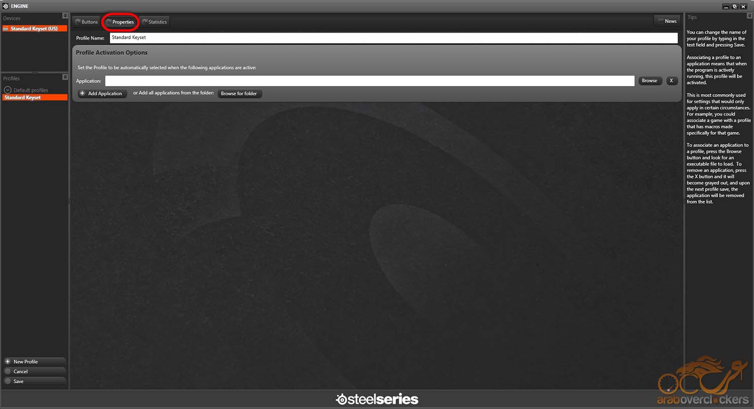 قائمة Properties تختص بأمر واحد وهو ربط أي Profile بأي برنامج تريد, كمثلاً تقوم بعمل تعديلات تساعدك في لعبة مثلBF وتحفظة وبدلاً من فتح البرنامج وتفعيل الProfile قبل اللعب يقوم البرنامج تلقائياً بذلك الأمر بمجرد فتح اللعبة خال قمت بتعيين ذلك الخيار في الصفحة هنا. وهذا أمر رائع.