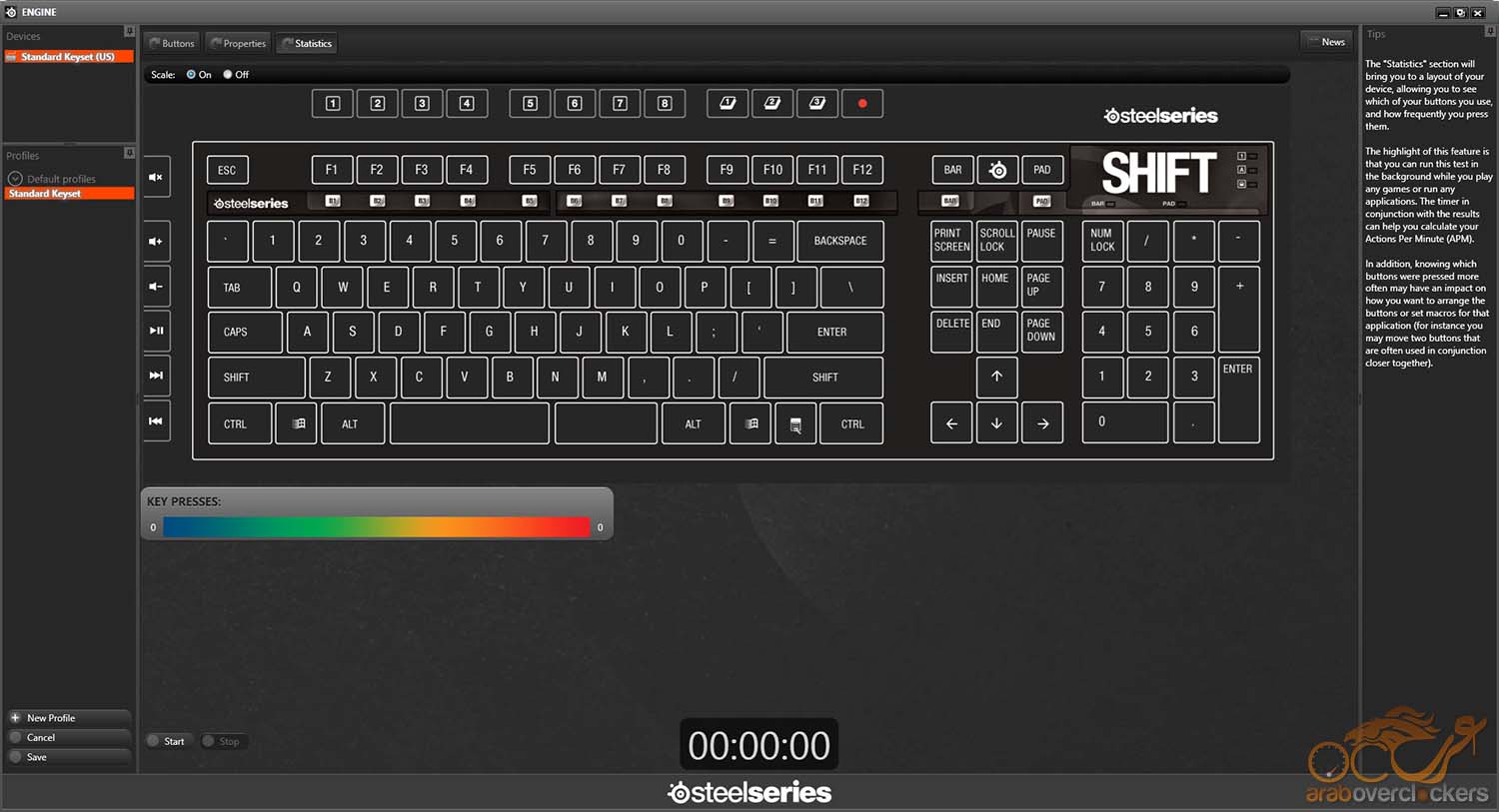 ووظيفتها أنها تعطيك ملخص بالأزرار الأكثر أستخداماً وكذلك عدد الضغطات علي كل زر علي حدي لفتره زمنية معينة. فقط أضغط Start وتابع عملك أو لعبك وأترك البرنامج يعمل في الخلفية وسيقوم هو بعملية التسجيل والملاحظة.
