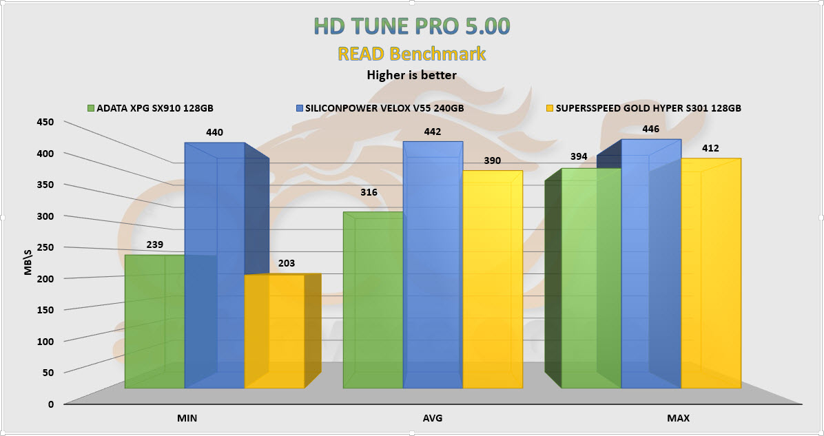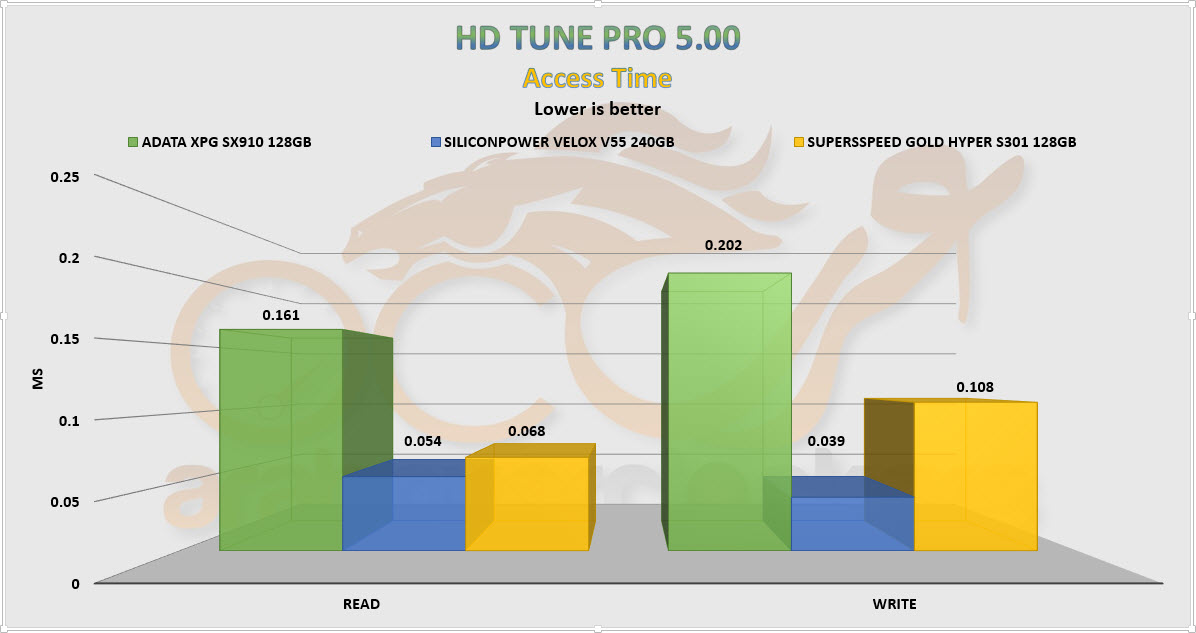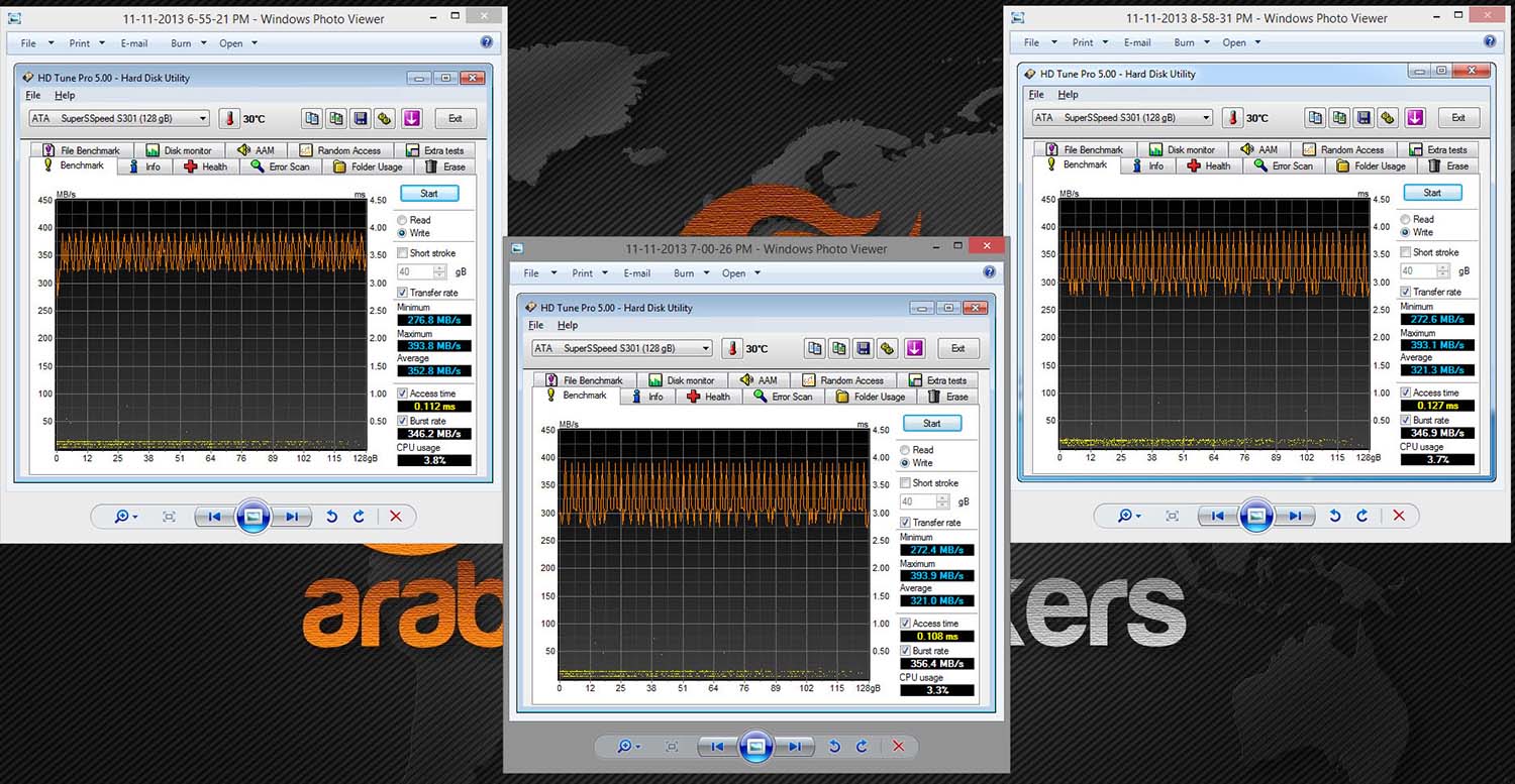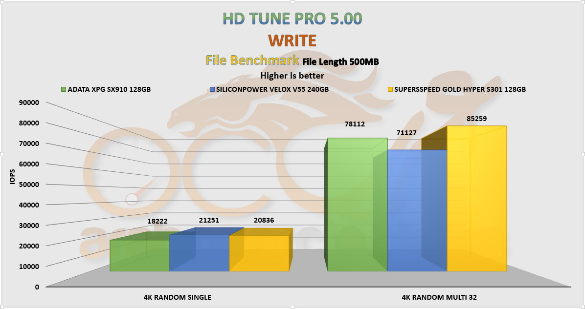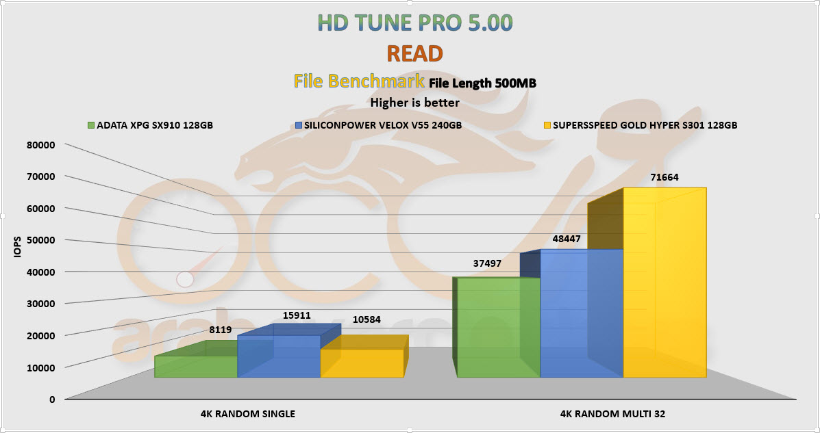 حافظ قرص Silicon Power علي مستواه المتميز خلال اختبار القراءة, لكن عاد قرص SuperSSpeed ليصفع كلا القرصين الأخرين في إختبار الكتابة كذلك في إختبار IOPS للكتابة والقراءة.