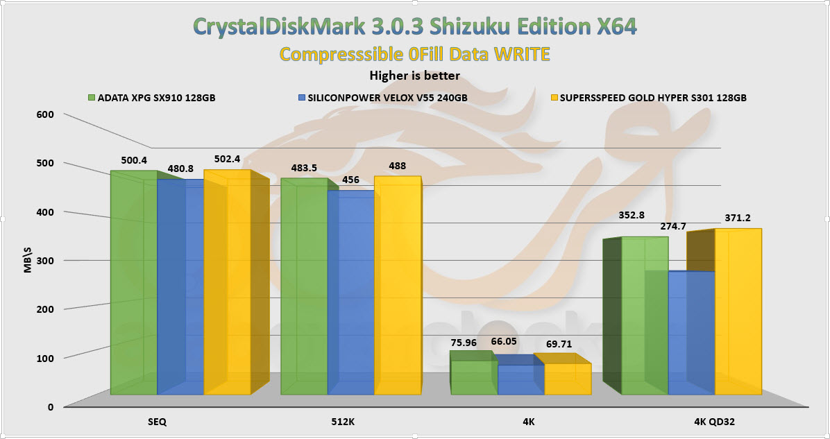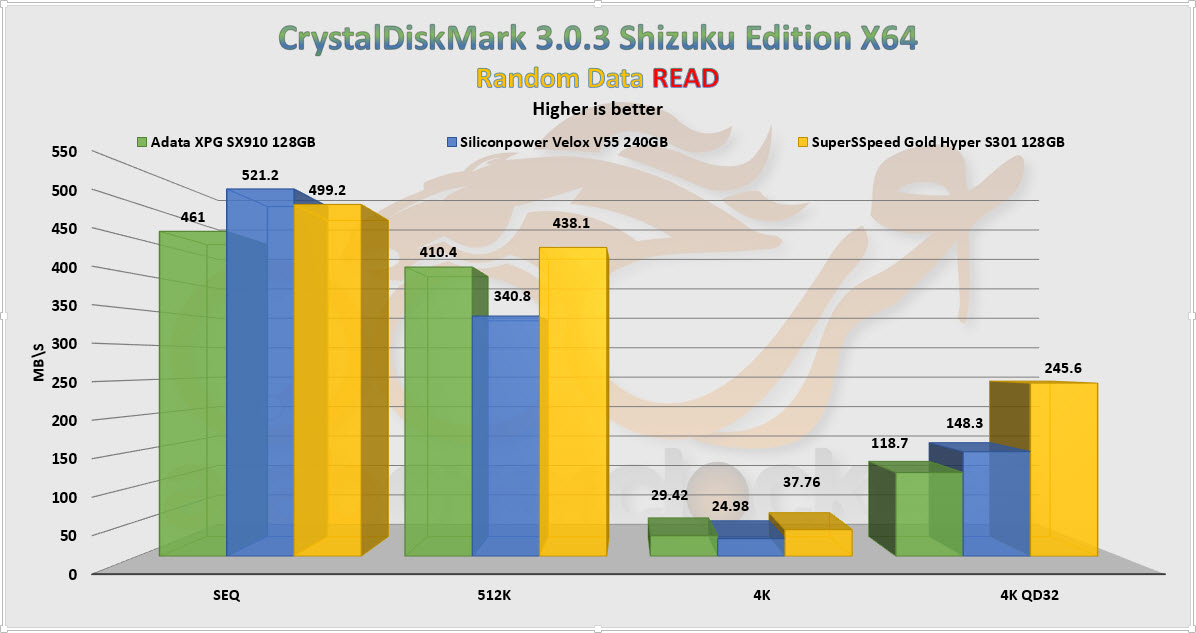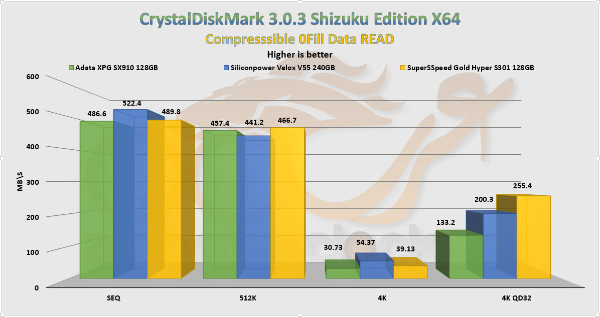 في هذا الأختبار النتائج بين الثلاث اقراص متقاربة للغاية ويبدو أن متحكم Sandforce في كلا قرصي ADATA و SuperSSpeed قد وجد المكان الذي يحترف إظهار قوته فيه فوصلت النتائج لقرابة ال500MB\s في كلا الأختبارين.