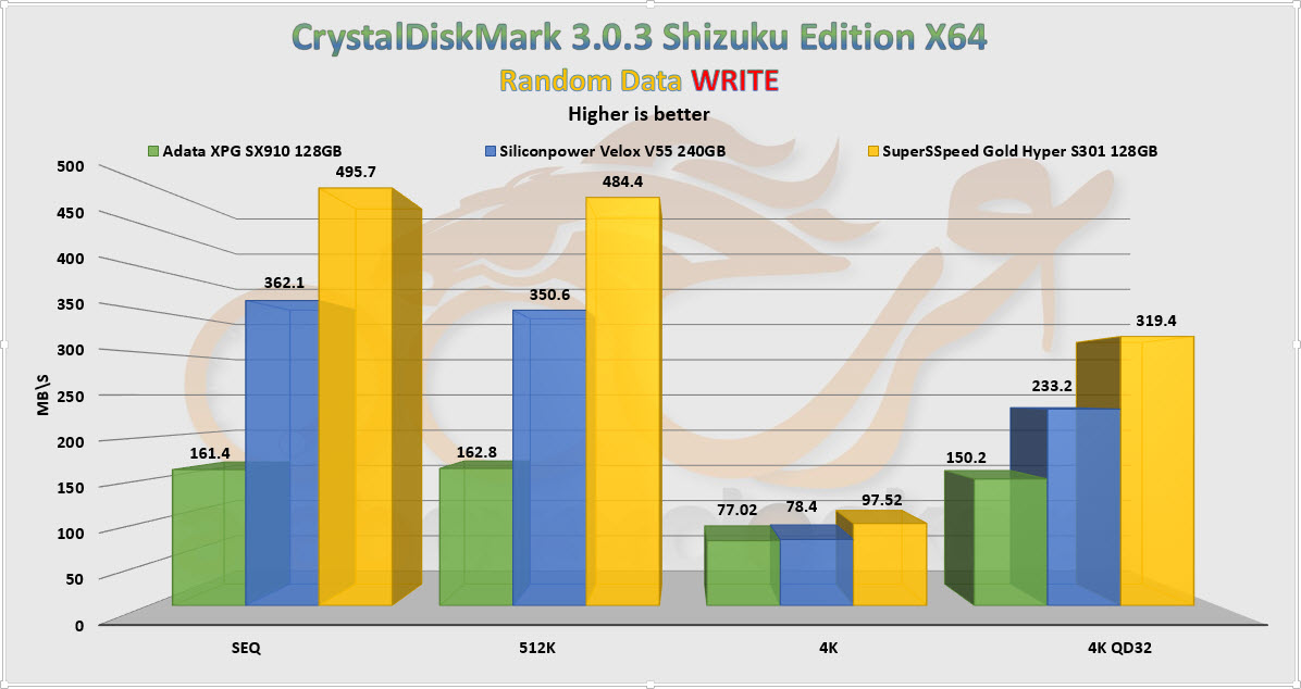 تفوق واضح وبفارق كبير لقرصSuperSSpeed S301 من Richmax في مجال الكتابة ليؤكد ما سبق وذكرناه عن قدرة شرائح SLC القوية في مجال الكتابة, وحتي في مجال القرائة تفوق قرص Silicon Power ليس بالكبير في المجال التتابعي لكن عاد قرص اليوم ليواصل تقدمة في بقية الحالات.