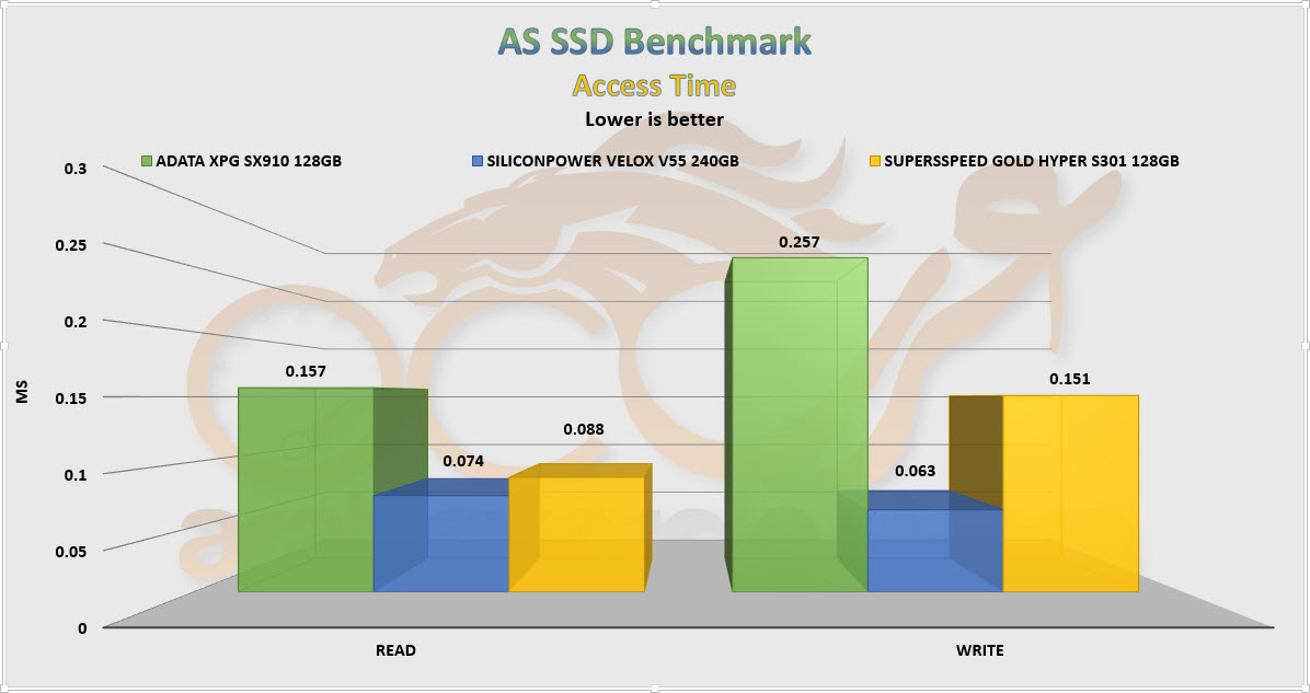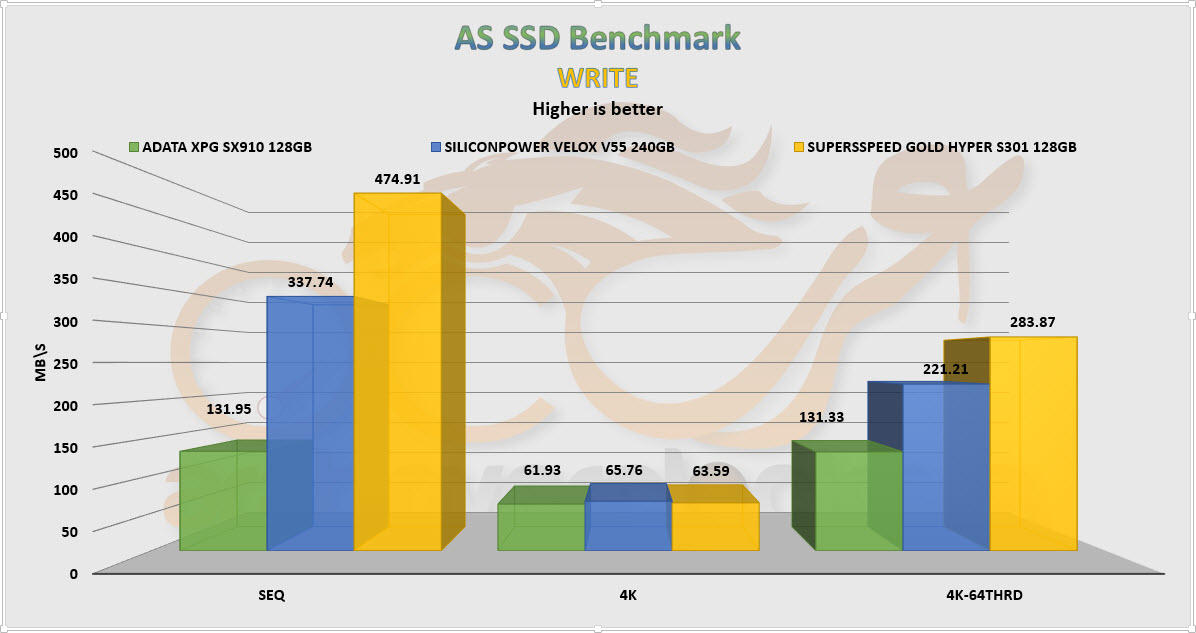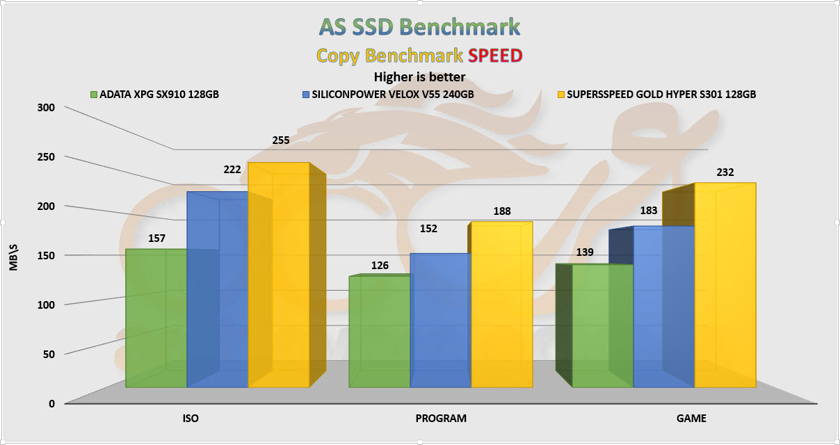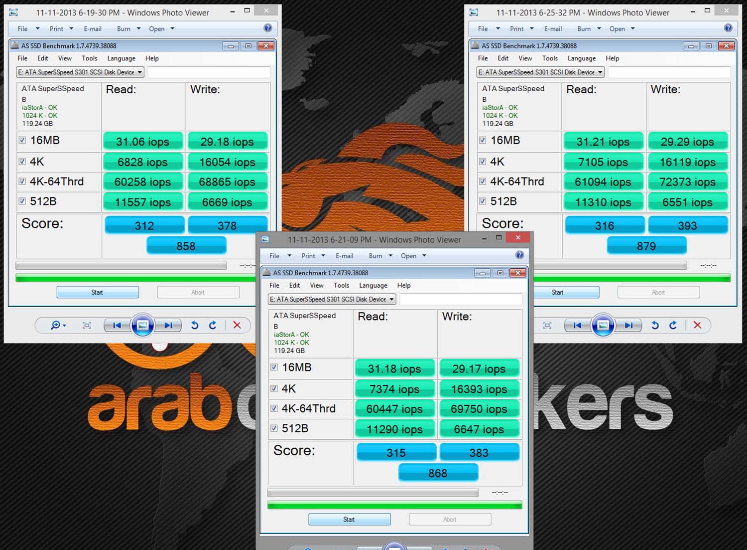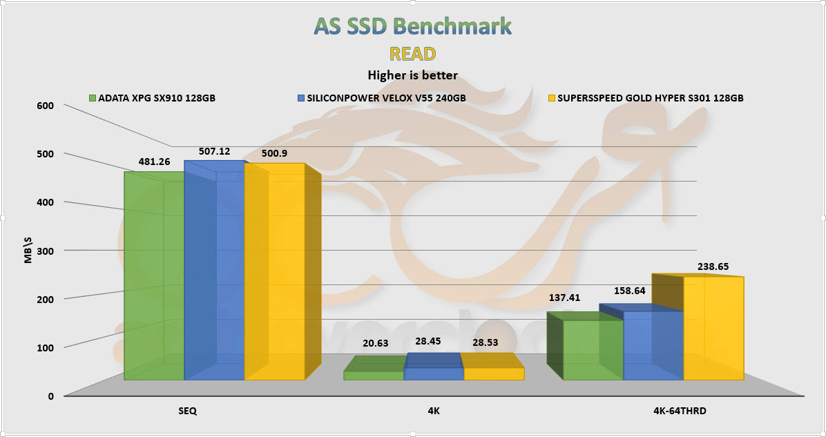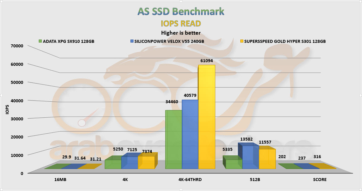 إختبار ممتاز لقياس سرعة نقل البيانات جاء فيه قرص SuperSSpeed 301 متقدماً بفارق 30MB/s عن قرص Silicon Power اما قرص ADATA فتفوق عليه القرص بما يقارب 100MB/s.