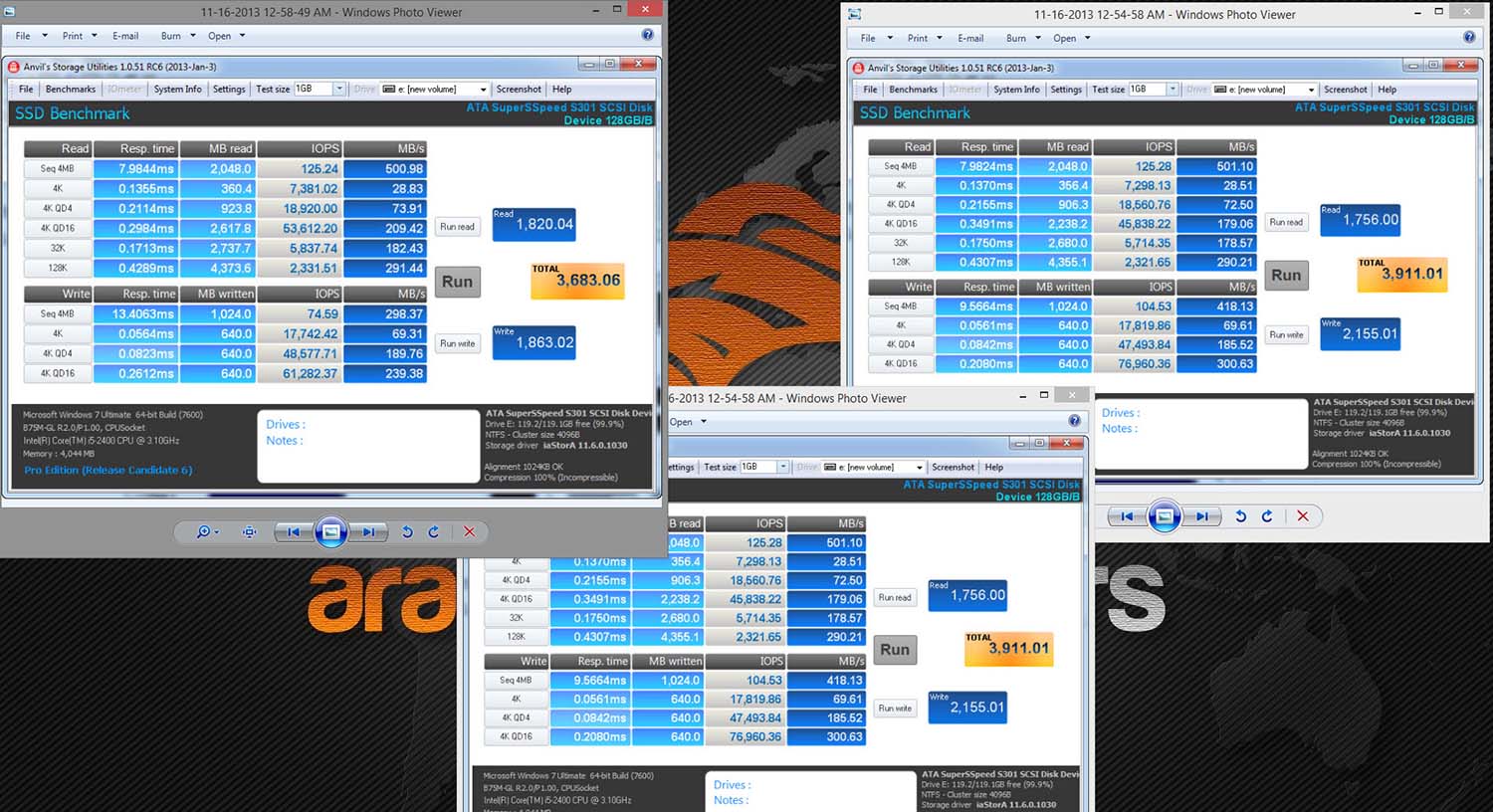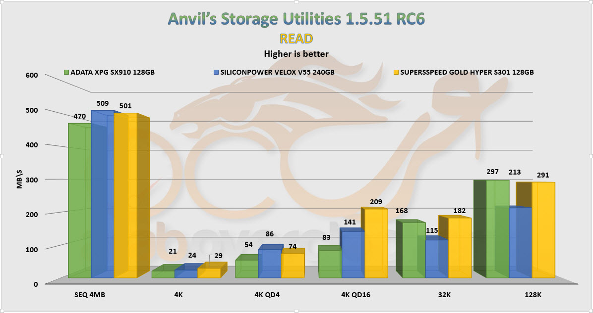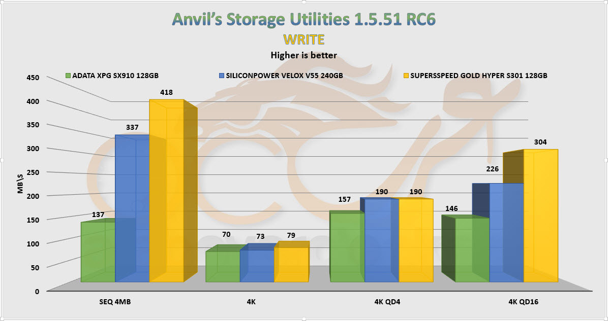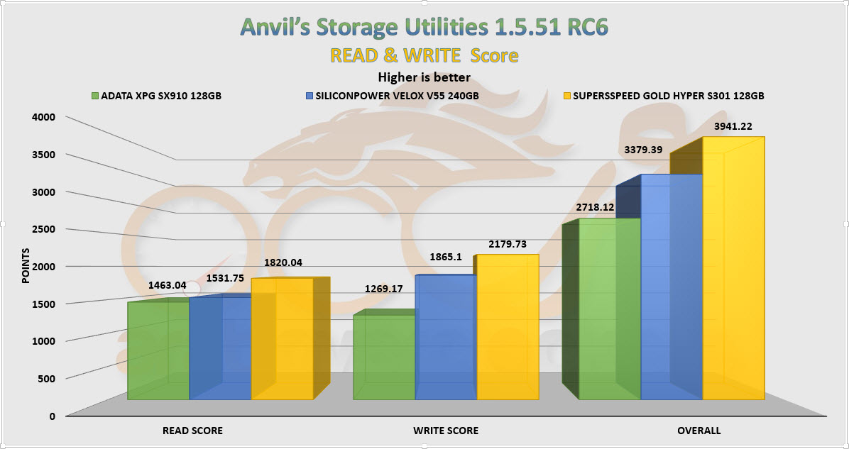 مرة أخري يتفوق قرص SuperSSpeed في مجال الكتابة ويحصل علي أعلي تقيم إجمالي من البرنامج يسحق فيه قرص ADATA ويتفوق بفارق ليس بالهين علي قرص Silicon Power.