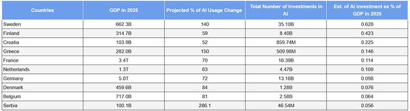 - السويد في الصدارة، حيث سيصل حجم استثمارات الذكاء الاصطناعي إلى 0.63% من اقتصادها مع نهاية 2025، وهي أعلى نسبة في أوروبا.