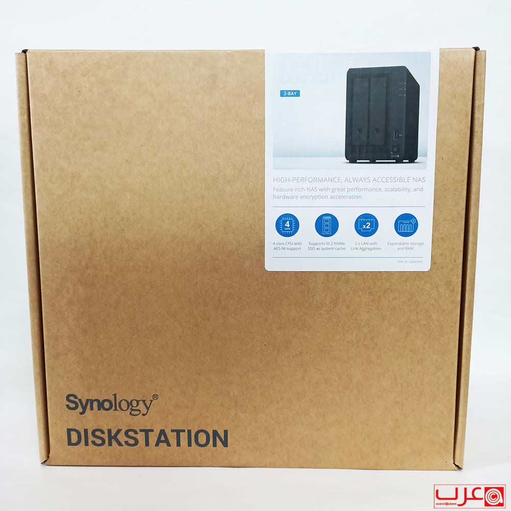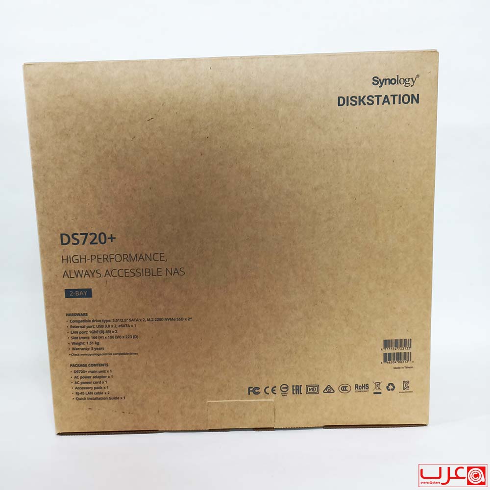 يأتي جهاز DS720+ في صندوق الورق المقوى باللون البني غير اللامع وهو ليس فاخرًا في المظهر ولكنه صديق للبيئة بالتأكيد. ويمكن التعرف على المنتج من خلال ملصق الصندوق، الذي يقوم بذكر المعلومات السريعة حول ال NAS في الجانب الأمامي. وبشكل عام فهو تغليف بسيط وسهل الاستخدام والنقل.