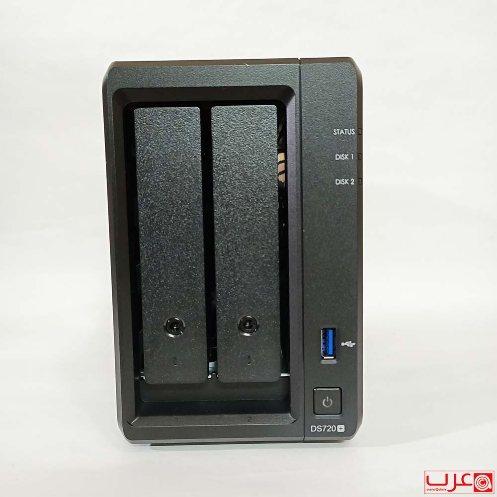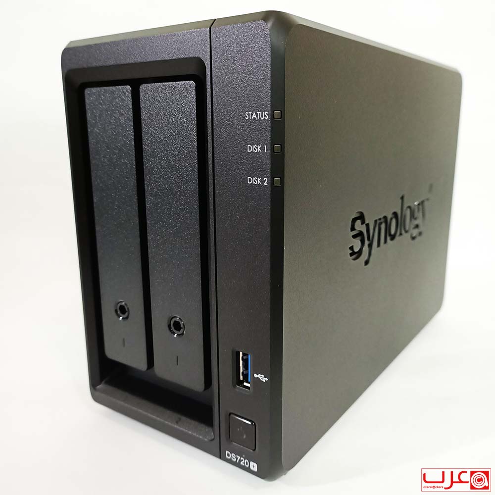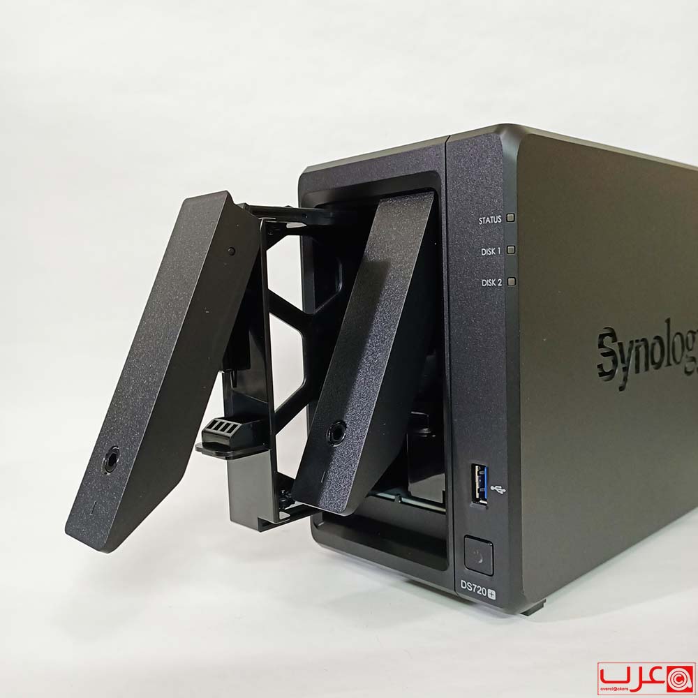 ويتميز DS720 + بفتحات لمحركات الاقراص مماثلة يمكن الوصول إليها من الأمام مع صواني محرك بلاستيكية قابلة للإزالة والقفل يمكن أن تأخذ محركي أقراص صلبة SATA أو SSD مقاس 3.5 أو 2.5 بوصة. وهناك منفذا إيثرنت 1 جيجابت في الخلف، إلى جانب منفذ e-SATA ومنافذ USB 3.0 (USB 3.1 Gen 1) في الأمام والخلف.