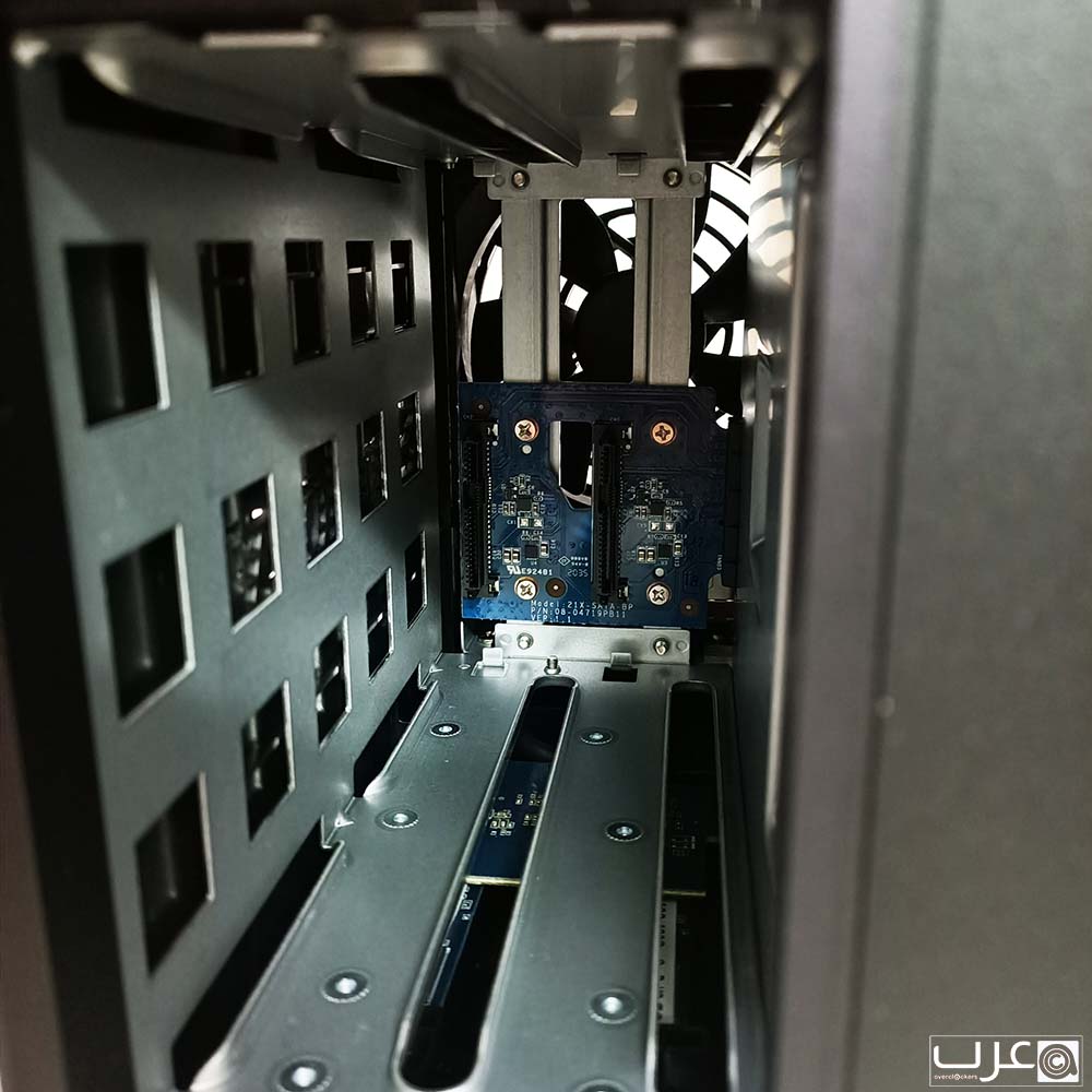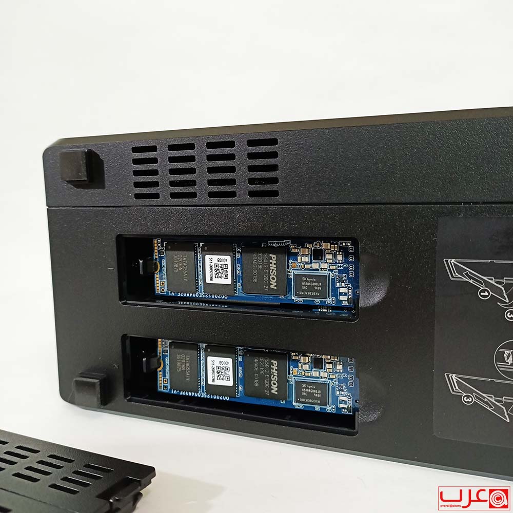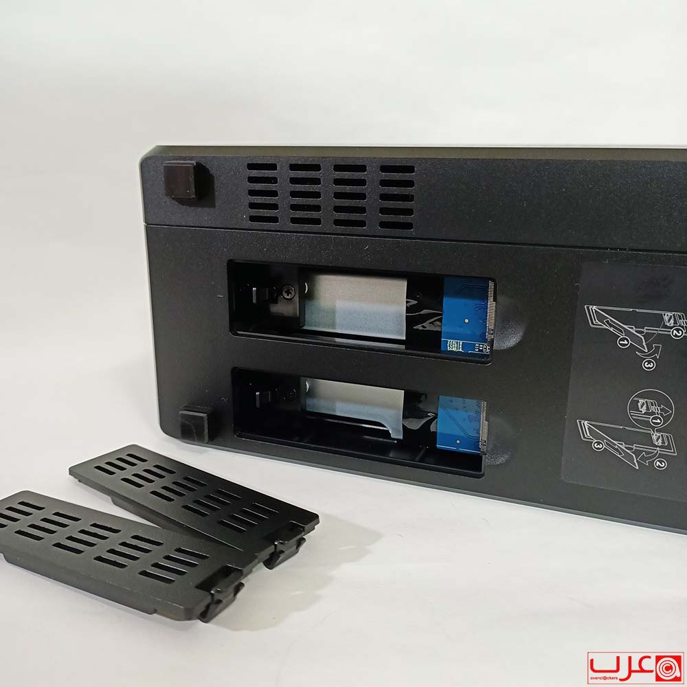 ويوجد بأسفل المنتج غطائان ممدودان قابلان للإزالة لتركيب محركات أقراص M.2 2280 NVMe SSD للتخزين المؤقت لمحركات الأقراص التقليدية المثبتة في الفتحات الداخلية. إن عدم القدرة على استخدامها للتخزين ايضا أمر مزعج إلى حد ما، ولكن هذا ما يحدث.