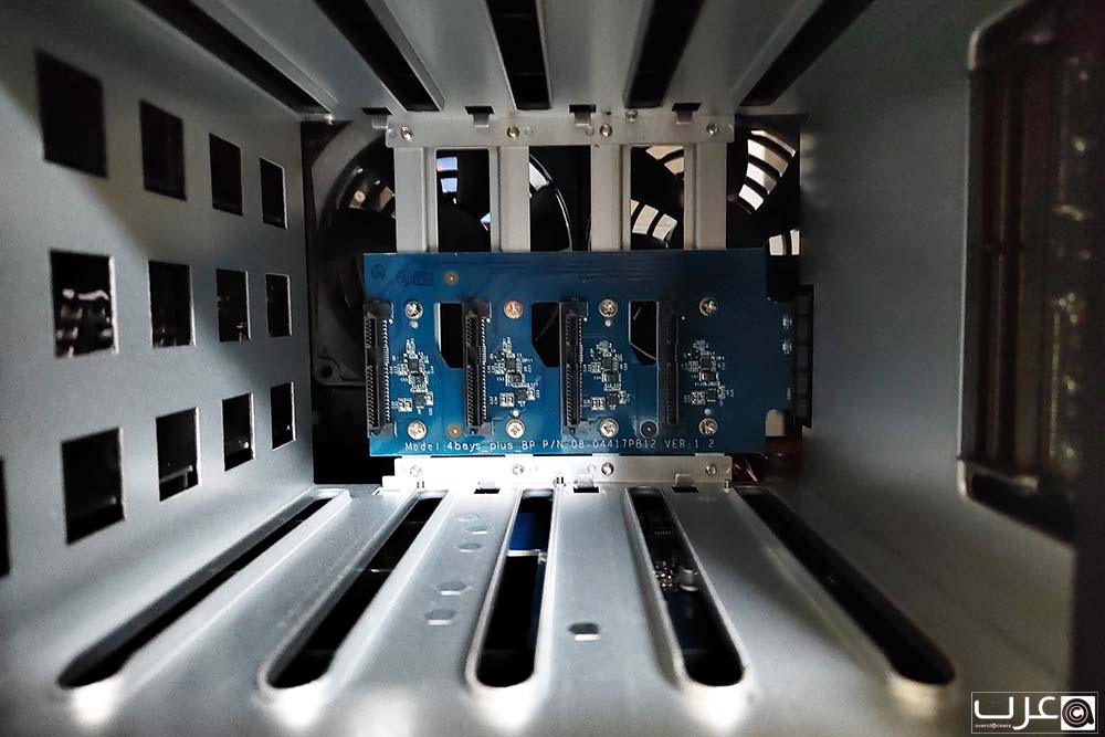 الامر الجيد بشكل خاص في فتحات M.2 هذه هو أنها تستخدم مشبكًا مرنًا في أحد طرفيه بدلاً من المسمار الصغير الذي يسهل إسقاطه عند التثبيت. فسقوط احد هذه المسامير داخل ال NAS قد يكون كارثيًا، لذا فإن تجنب هذا الاحتمال هو خطوة ذكية من جانب المصمم.